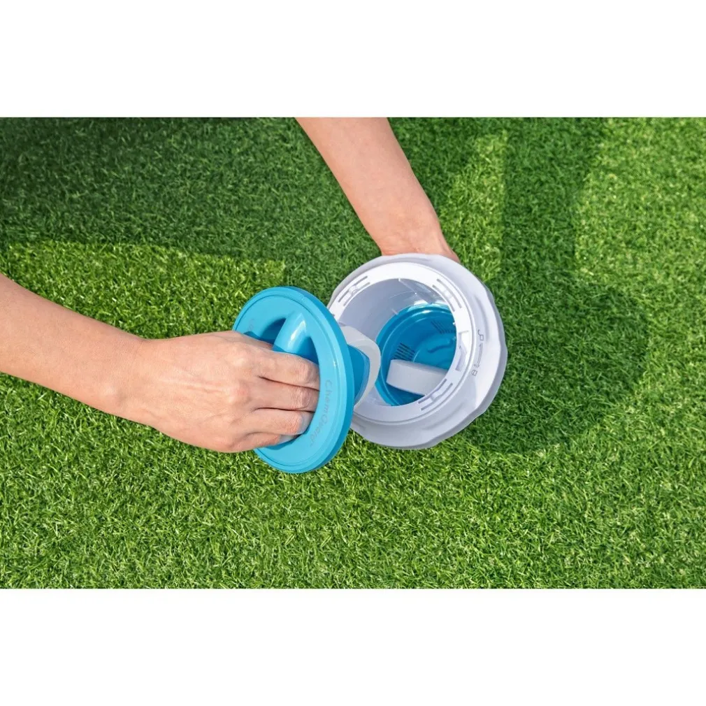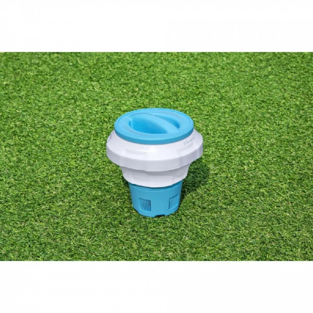 Può contenere pastiglie di cloro o bromo fino a 7,6 cm di diametro, che vengono rilasciate gradualmente grazie al meccanismo di regolazione integrato.