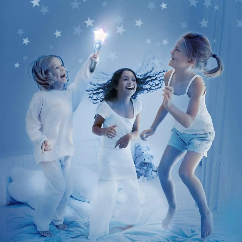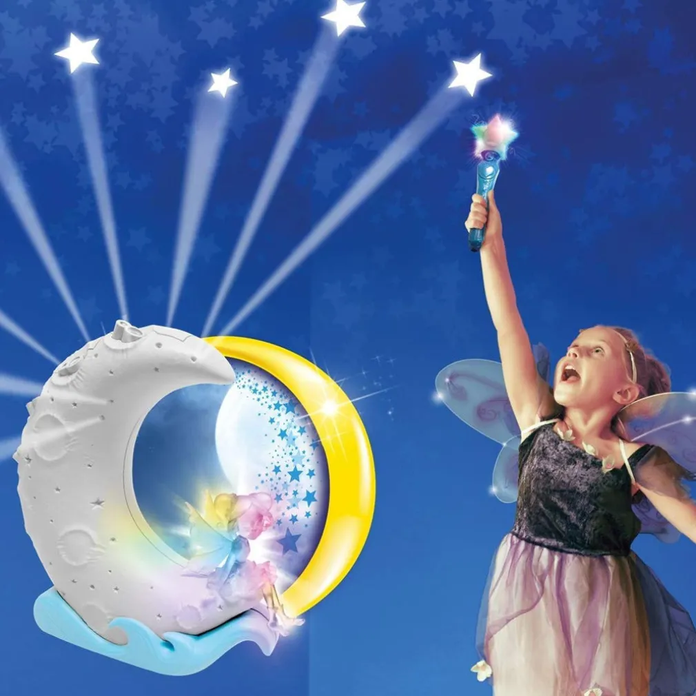 Una stanza buia, la bacchetta in mano e il gioco può iniziare. Con Cattura le Stelle, le bambine ameranno catturare le stelle che appariranno sui muri grazie al proiettore a forma di luna. Le magiche stelle saranno visibili per pochi secondi, bisogna essere le più veloci a prenderle con la bacchetta. Mentre ti muovi attraverso i livelli, le stelle lampeggiano sempre più velocemente. Passa la tua bacchetta al prossimo giocatore per condividere il divertimento o sfidarti a vicenda e vedere chi può raggiungere il livello più alto. Inizia con la modalità di gioco “Facile”, quindi passa alla modalità di gioco “Difficile” quando hai perfezionato le tue abilità. Ogni 3 stelle che accumuli, salirai di livello. Raggiungi il livello 10 e osserva come un arcobaleno di colori viene visualizzato sulla tua bacchetta e ascolta una melodia speciale. Vince chi riuscirà a prendere il maggior numero di stelline illuminate. Ma Quando il divertimento è finito, passa alla modalità “luce notte” e vai dolcemente a dormire sotto uno spettacolo di luci mentre ascolterai la rilassante ninnananna.