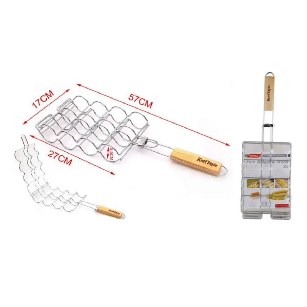 La griglia per barbecue perfetta per il tuo barbecue. Per cuocere carne, pesce e verdure, ideale per una braciata in ogni occasione! Le pannocchie di mais grigliate sono un classico del barbecue, ma per ottenere un risultato invidiabile è necessario avere i giusti accessori. La graticola garantisce un cottura omogenea del cibo e grazie alla comoda impugnatura in legno, girare le pannocchie sul grill è un gioco da ragazzi! Questo accessorio può essere utilizzato anche per grigliare altre verdure o le cosce di pollo. La griglia permette di posizionare il cibo anche sul braciere.
