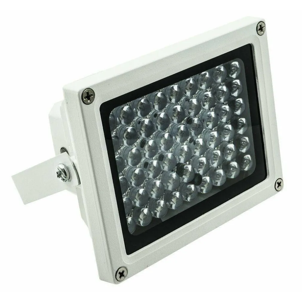 Questo super illuminatore infrarosso è dotato di 54 led ad alta efficienza che ne garantiscono l’efficacia su notevoli distanze. Adatto in ampi spazi come giardino, retro della propria abitazione, ecc.. oppure dove l’illuminatore della nostra telecamera risultasse insufficiente. Insomma la soluzione giusta per qualunque tipo di telecamera. L’illuminatore è già fornito di staffa di fissaggio forata, per semplificarne l’installazione con cavo dotato di spinotto per inserirvi un alimentatore da 12 volt (non incluso nella confezione). Il Faro và alimentato a 12 v (dc).