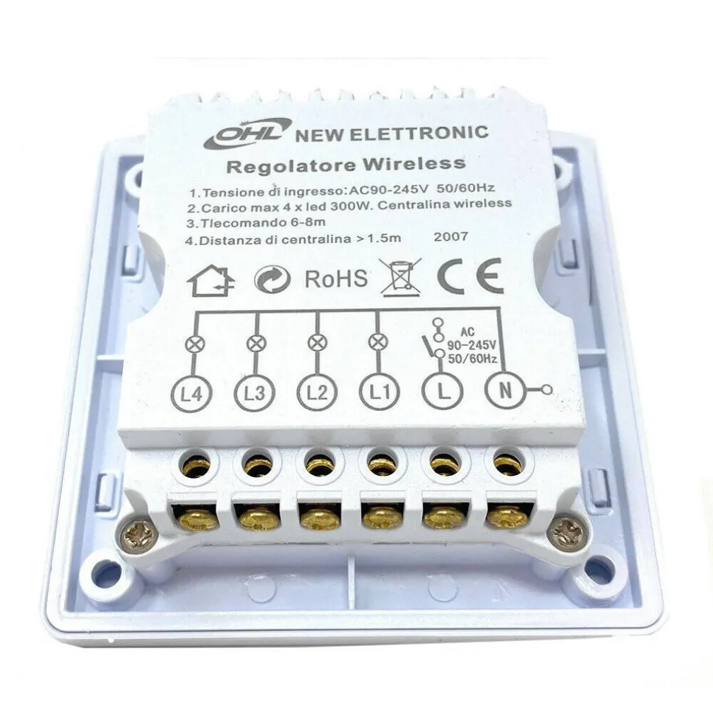 Sistema di comando ideato per gestire sistemi di illuminazione. Copre una distanza massima di circa 6/8 mt in modo wireless, il kit è composto da una centralina che viene direttamente incassata a muro ed un telecomando. Il telecomando è composto da 6 pulsanti (1,2,3,4 – on/off). Con i primi 4 è possibile associare un ambiente della casa, negozio o ufficio e con i tasti ON/OFF per accendere o spegnere contemporaneamente tutte le luci associate su ogni canale. Inoltre, i canali sono gestibili anche dalla centralina stessa, sarà quindi possibile accendere e spegnere le luci sia dal telecomando che dalla centralina.