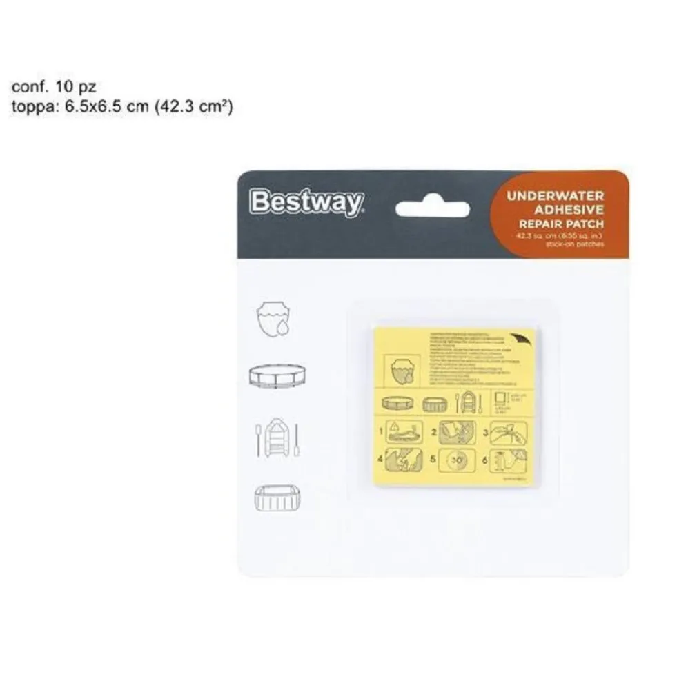 Le toppe di riparazione per uso in acqua sono una soluzione semplice e veloce per riparare le forature sui prodotti gonfiabili. Ogni confezione include 10 toppe ottime per riparare canotti, piscine, spa e materassi gonfiabili. Garantisce la resistenza all’acqua, permettendovi di risolvere i problemi sotto la linea di galleggiamento. Ogni toppa di riparazione è ideale per riparare piccole forature e abrasioni. Per applicare queste toppe autoadesive basta pulire l’area danneggiata del vostro gonfiabile, staccare la pellicola sul retro ed incollarla con cura al gonfiabile. Una volta applicata, lasciatela riposare per 30 minuti.
