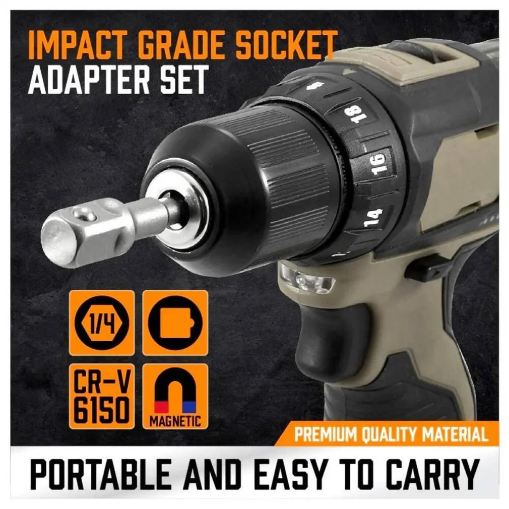Ogni adattatore realizzato in acciaio al cromo vanadio (CR-V) temprato trattato termicamente, buona resistenza all’abrasione ed elevata durezza, senza rotture o ruggine, offre resistenza e durata nel tempo. Cuscinetto a sfera caricato a molla sulla testa, progettato per adattarsi saldamente fornendo versatilità e praticità indipendentemente dallo strumento utilizzato. Compatibile con utensili elettrici comuni e pesanti, driver, chiavi a mano e utensili con impugnatura per cacciavite per usi flessibili. Tutti gli adattatori per chiavi a bussola sono con codolo esagonale da 1/4″, le prese per avvitatore ad aria compressa con codolo esagonale da 1/4″ si adattano a tutti i mandrini a cambio rapido e ai mandrini standard, connessione rapida, lavoro su mandrino a cambio rapido, mandrino standard,