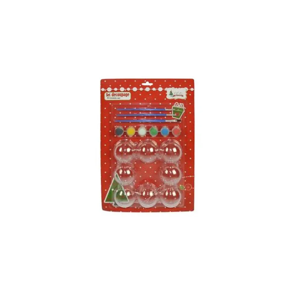 Dai sfogo alla tua creatività e crea le tue palle di natale personalizzate con il kit decoupage composto da 8 palline trasparenti da decorare con pennelli e tempere incluse, puoi rivestirle e decorarle a tuo piacimento e creare le tue palle di natale personalizzate da applicare al tuo albero. La confezione comprende 8 sfere in plastica trasparente dal diametro di 6 cm, 3 pennelli e 6 colori.