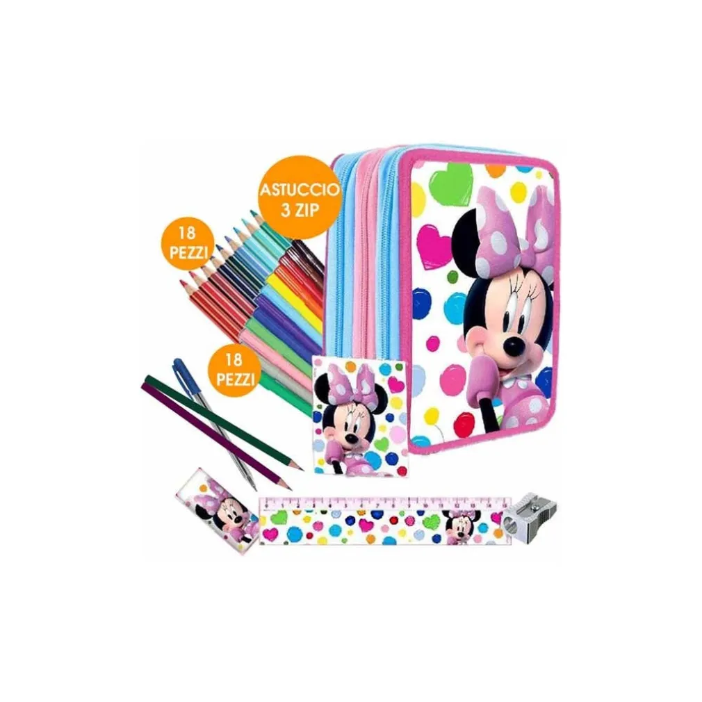 Splendido Kit Scuola School Pack Disney con protagonista Minnie Mouse. Lo Zaino estensibile completamente ergonomico, è dotato di spallacci imbottiti che consentono di tenere comodamente il peso in spalla. L’astuccio a 3 zip è accessoriato per la scuola e il disegno e comprende 18 pennarelli, 18 pastelli, 2 matite, 1 gomma per cancellare, 1 penna a sfera blu, 1 righello, 1 temperamatite e 1 taccuino. Parti per la scuola con questo fantastico School Pack Disney Minnie Mouse!