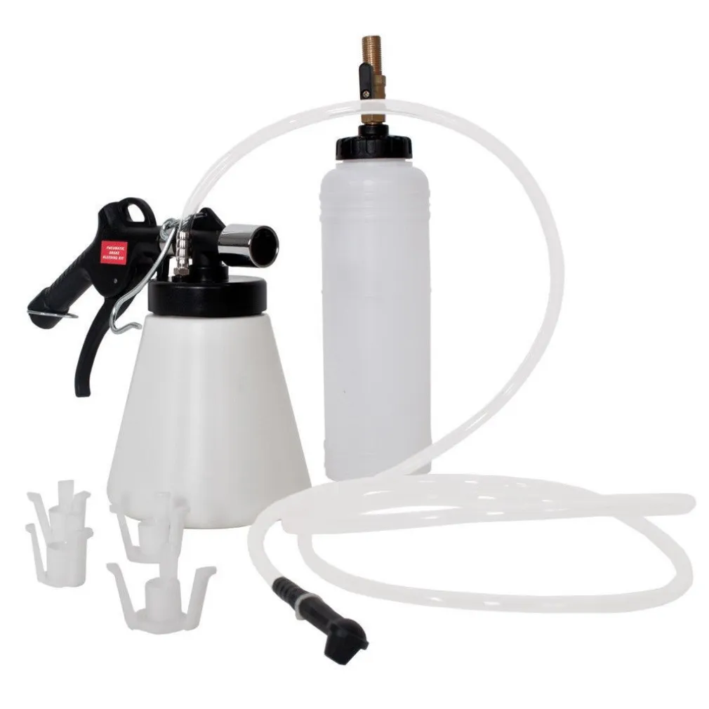 Con questo pratico utensile comprensivo di recipiente di riempimento puoi spurgare i freni senza problemi. Avrai bisogno solo di un’alimentazione di pressione standard da 6-12 bar. Il sistema frenante potrà essere spurgato da una sola persona. Questo sistema di spurgo è utilizzabile anche per sistemi di accoppiamento e sterzo. Lo spurgatore per freni estrae il liquido dal nipplo di spurgo, al fine di spurgare o cambiare completamente il liquido dei freni. Compreso in dotazione anche un tubo flessibile per l’aspirazione del liquido e 4 adattatori da avvitare.