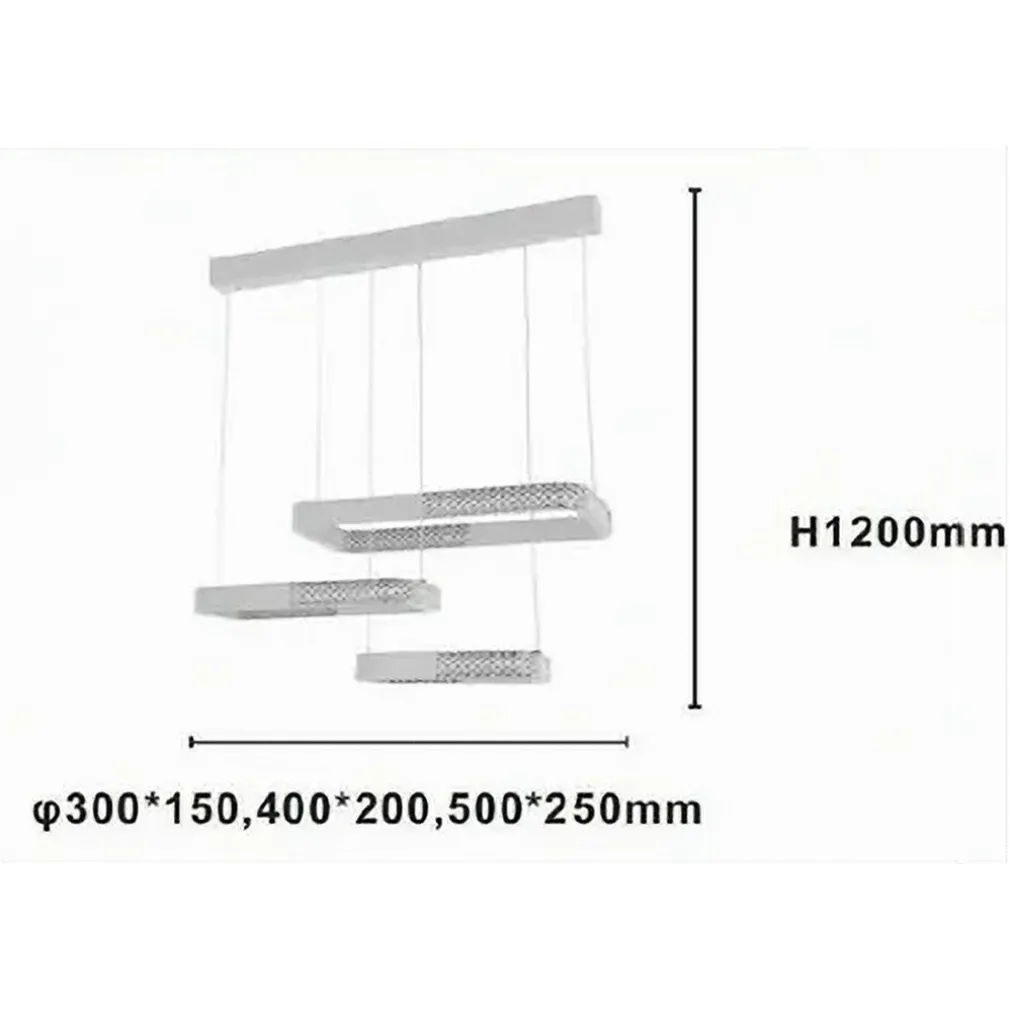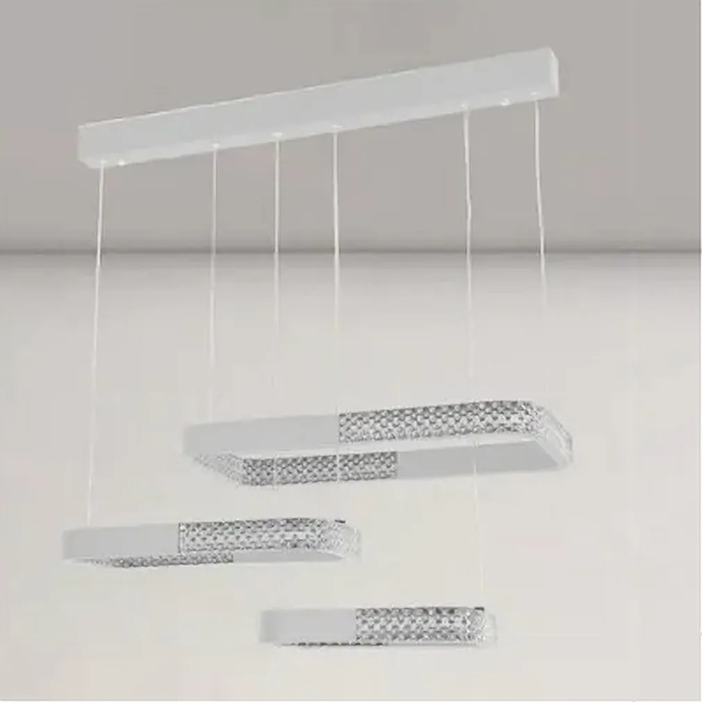 Il LAMPADARIO A SOSPENSIONE LED 68W 3 RETTANGOLI CRISTALLO TELECOMANDO BIANCO si distingue per il suo design moderno con dettagli effetto cristallo e la capacità di personalizzare tonalità e intensità della luce tramite telecomando.