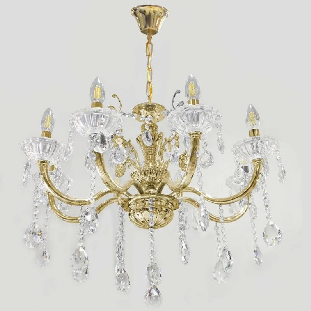 Lampadario da soffitto a 6 braccia impreziosito da gocce pendenti in acrilico che catturano e riflettono la luce offrendo un magnifico gioco di colori. Dotato di sei portalampada con attacco e14 (lampadine non incluse). Grazie al suo design regale, è perfetto per il vostro ingresso, sala da pranzo, soggiorno e altro ancora. Disponibile in due diverse colorazioni, oro o argento.