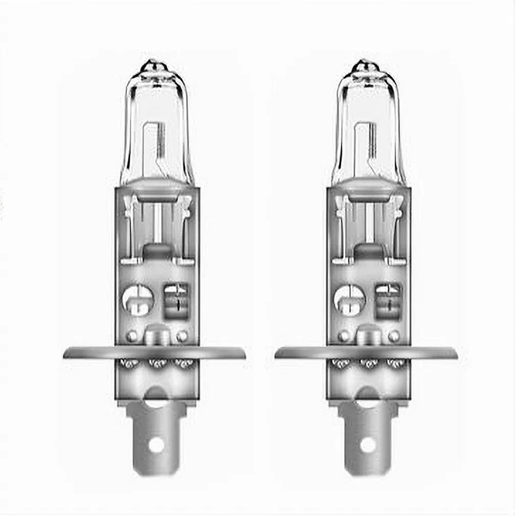 Coppia di lampadine alogene per auto con attacco H1. Producono un fascio di luce luminosissimo con una gradazione intorno ai 3000 kelvin a luce calda.