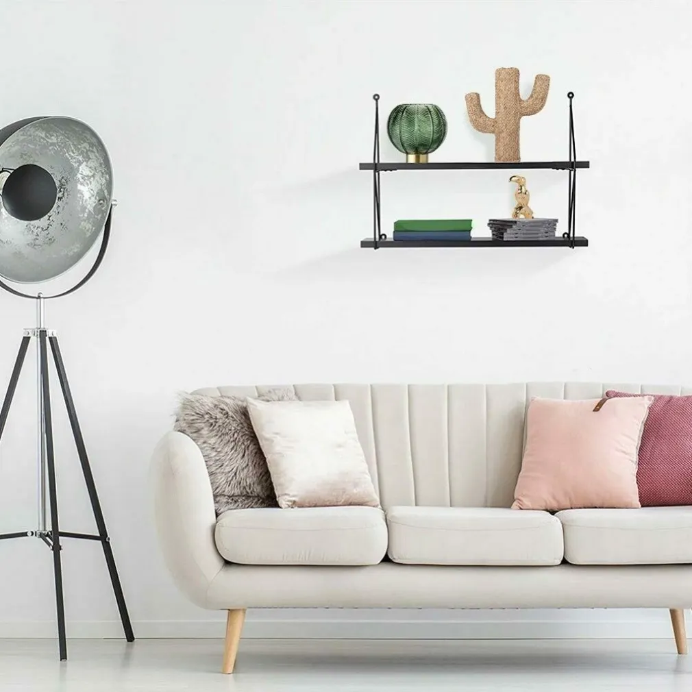 Dona un tocco di stile e design all’arredamento di casa tua con questa bellissima libreria da parete a 2 ripiani. La libreria è realizzata con una solida struttura in metallo con ripiani in legno mdf in un elegantissimo colore nero ed è fornita di 2 ripiani d’appoggio. Facile da installare alla parete grazie ai pratici fori presenti sulla struttura ella libreria. Dal design moderno e minimale ma molto particolare, questa bellissima libreria da parete è perfetta per valorizzare oggettistica e complementi d’arredo oltre a rendere unico l’arredamento di casa tua. I materiali utilizzati e la loro versatilità rendono la libreria da parete un complemento d’arredo di altissima qualità perfetto per chi ama i complementi di design e per chi ama curare l’arredo del proprio appartamento in ogni dettaglio.