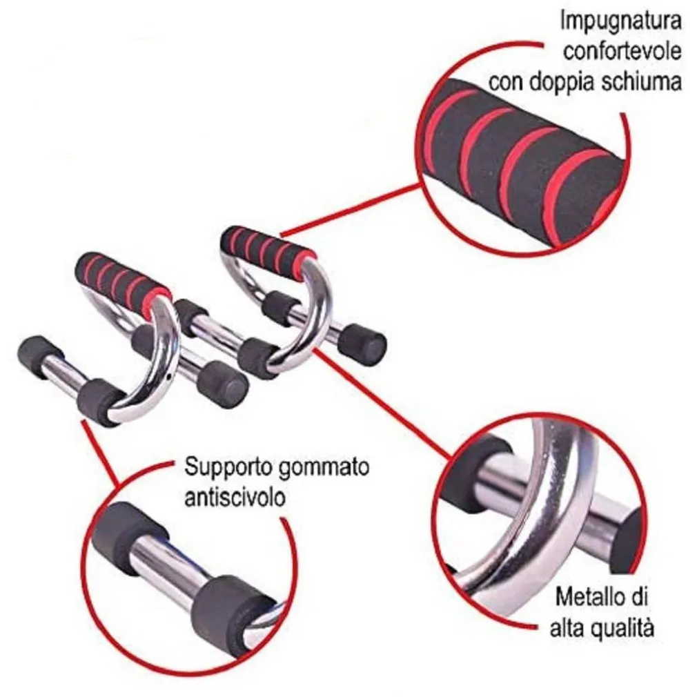 FITNESS PUSH UP STAND BAR è un accessorio per il fitness. In acciaio laccato, con manici rivestiti da schiuma ad alta densità che garantiscono la sicurezza della presa durante l’allenamento. Dall’insolito design a forma di S ergonomico e stabile, aiuta a ridurre la pressione sul polso e proteggere le articolazioni delle mani. Comodi da usare, leggeri, ti permettono di effettuare gli esercizi ovunque: casa, ufficio, all’aperto, in palestra. Particolarmente indicato per allenare petto, spalle, schiena, tricipiti e addome. Il suo utilizzo aiuta a perdere peso. Non è previsto alcun montaggio.