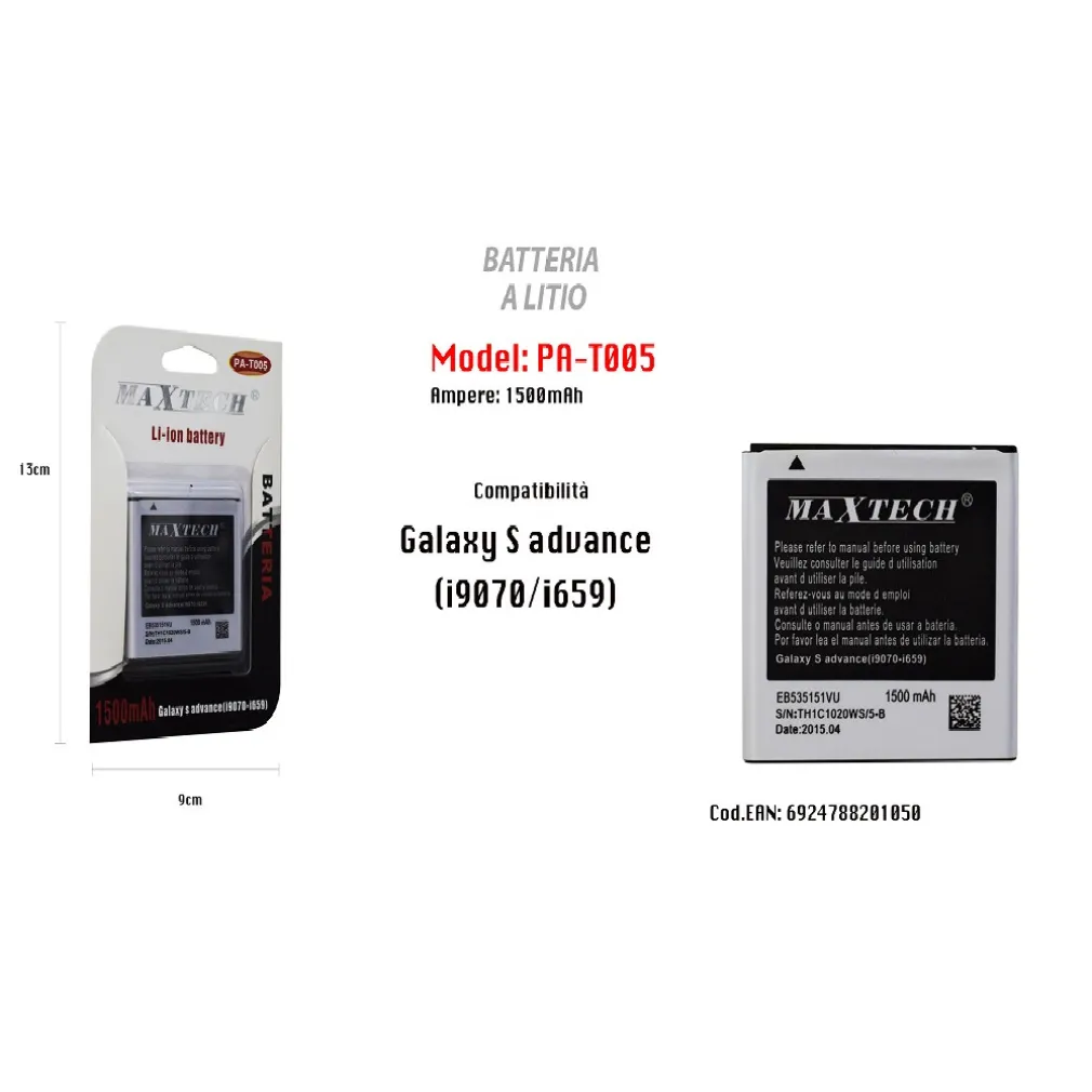 Se stai cercando una batteria di alta qualità per il tuo Samsung Galaxy S Advance i9070 i659, la MAXTECH PA-T005 è la scelta perfetta. Questa batteria al litio Li-ion da 1500mAh è progettata appositamente per garantire prestazioni affidabili e durature per il tuo dispositivo.
