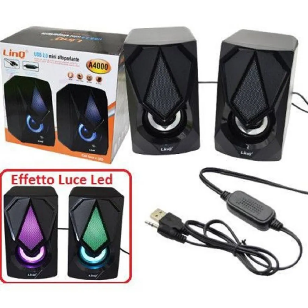 Altoparlante cablato con jack da 3,5 mm, A4000. Altoparlante di potenza integrato da 3 W x 2 che offre un suono pulito e bilanciato. Illuminazione LED RGB per una serata colorata. Pulsanti di controllo integrati e 4 cuscinetti antiscivolo. Con ingresso cuffia e regolatore di volume. Speaker realizzati in metallo, sprigionano una potenza nominale di 6 Watt RMS. Si alimentano collegandole al PC tramite un cavo USB. Dimensioni ridotte per facilitarne il trasporto. Riproduzione ottimale delle frequenze medie e alte. Diffusori schermati per prevenire distorsioni e garantire un’ottima qualità del suono. Per apprezzarne il suono basta connettere il jack 3.5mm alla presa audio del PC. Con 160W di picco e 3W x 2 RMS di stabilità, assicurano un’ottima godibilità del suono. Design compatto, elegante e raffinato. Compatibile con: PC, Mac, Netbook, Lettori Mp3, TV, Console di gioco, Lettori CD/DVD. Perfetto per l’uso a casa, in ufficio o nella configurazione di gioco…. Progettato per godere appieno dei suoni del tuo computer desktop, laptop, tablet, smartphone, lettore CD, ecc. …. L’altoparlante integrato ad alta potenza (3 W x 2) offre un suono pulito e bilanciato a qualsiasi volume. L’illuminazione a LED colorata aggiunge stile e carattere agli altoparlanti.