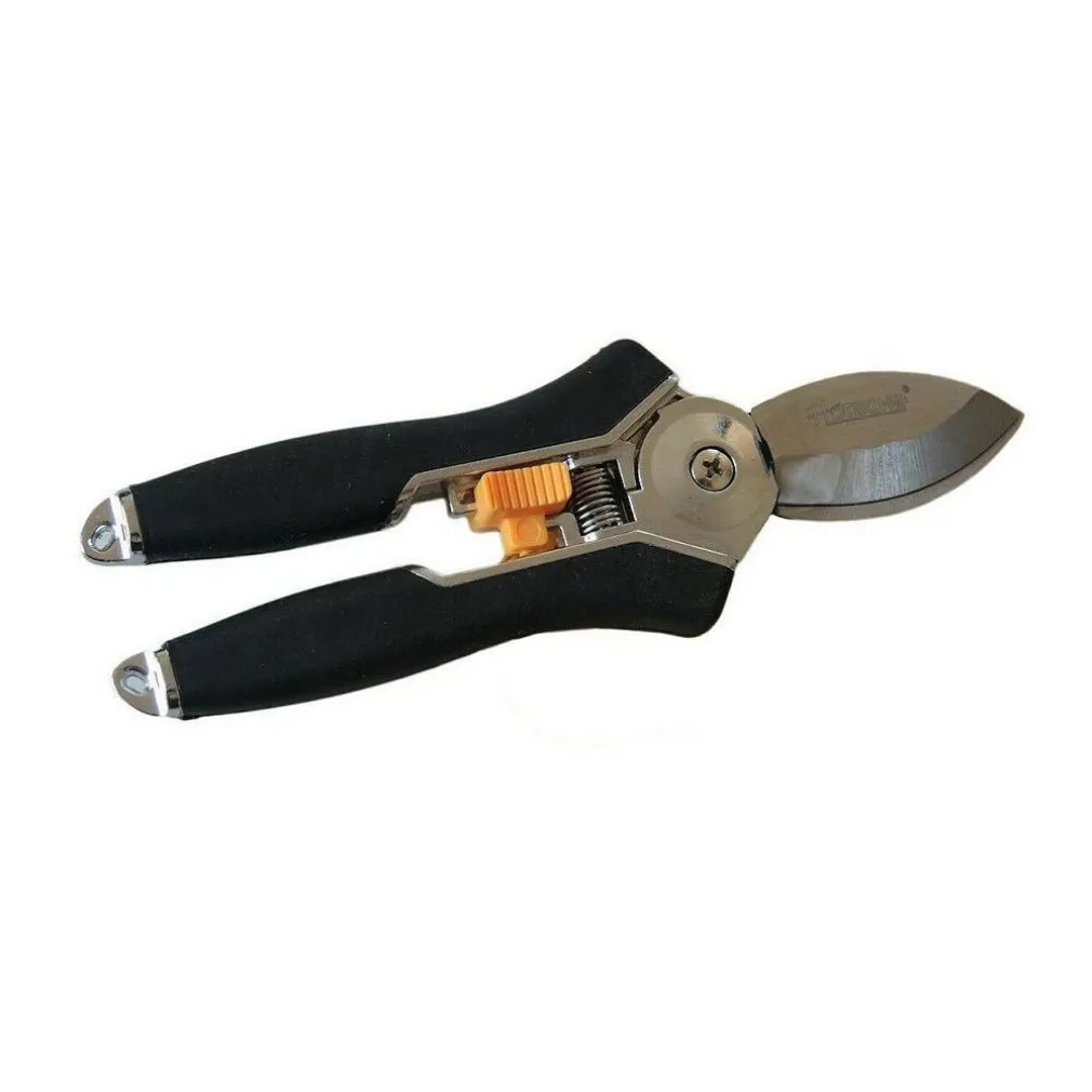 Forbice da potatura, con manico in plastica morbida antiscivolo ed impugnatura ergonomica. Lama a doppio taglio, anche per rametti da massimo 15 mm di diametro e con lama da 160 mm in acciaio. Dotata di gancio/sgancio comodo e veloce. Vite per una semplice manutenzione delle lame.
