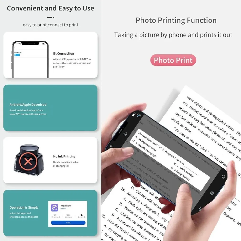 Anche se non hai esperienza con le stampanti, non preoccuparti. La mini stampante portatile è progettata per essere intuitiva e semplice da usare. Basta scaricare l’app gratuita sul tuo dispositivo mobile, collegare la stampante e sei pronto a stampare con un solo clic. È davvero così semplice!