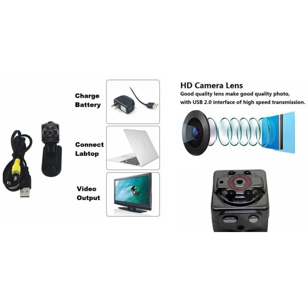 Mini telecamera alta definizione in soli 2 centimetri quadrati! 12 megapixel, microfono integrato, funzione snap shot, registrazione ciclica su supporto tft card micro sd compatibile fino a 32 GB (non inclusa), visione notturna, cavo alimentazione e video out incluso, accessori clip inclusi batteria al litio x 30/45minuti di autonomia a 14fps a 1080p o 30fps a 720p.