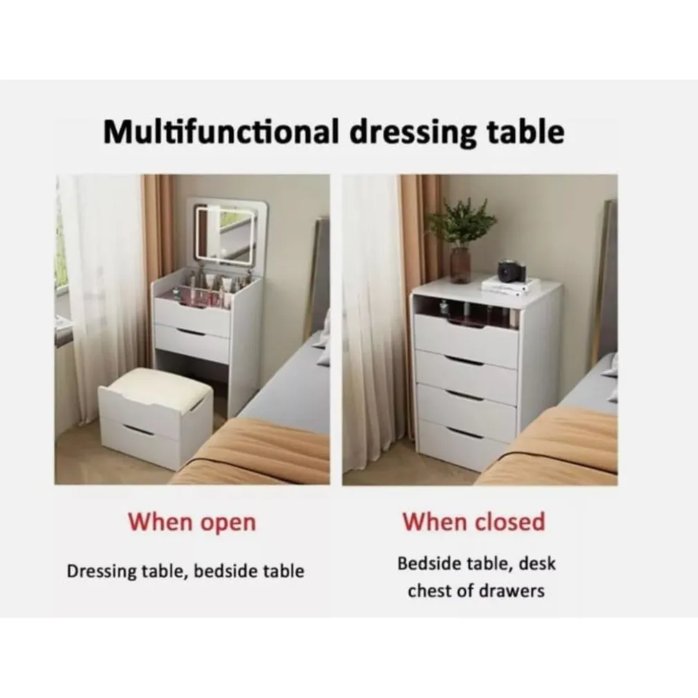 Raffina il tuo spazio con la toeletta 3 in 1 dal design moderno e funzionale. Perfetta non solo per il trucco quotidiano ma anche come scrivania per studio e lavoro, questo mobile versatile unisce eleganza, comfort e praticità. Con il suo specchio illuminato, lo sgabello nascosto e i cassetti capienti, diventerà il tuo angolo beauty preferito.