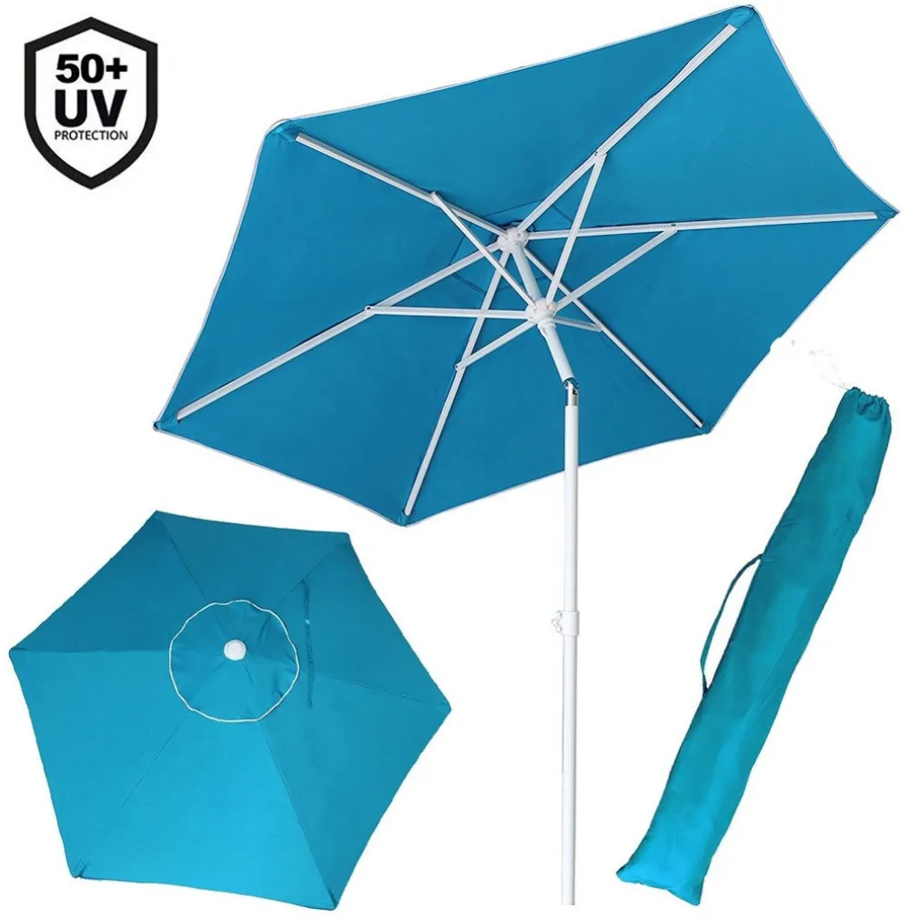 Goditi il massimo del relax al mare o in giardino con questo nuovissimo ombrellone da spiaggia! Questo bellissimo ombrellone da spiaggia ha un diametro di apertura di ben 210 cm ed è fornito di una solida struttura a 6 rami con palo spessorato da 32mm realizzati interamente in acciaio verniciato a polvere in colore bianco, la struttura inoltre è rinforzata da rivetti in acciaio che conferiscono a quest’ultima maggiore robustezza e durata nel tempo. Il palo infine è dotato di inclinatura regolabile che permette di dirigere l’ombra secondo le proprie esigenze. Il Telo di copertura è realizzato in tessuto poliestere 180gr con trattamento UV50+ che garantisce una protezione totale dai raggi UV del sole, la parte superiore è fornita di prese d’aria che impediscono accumuli di calore ed evitano che l’ombrellone voli via in caso di forti venti. Design semplice e minimale in un bellissimo colore azzurro, questo ombrellone è perfetto per la spiaggia, per il giardino e per qualsiasi ambiente esterno donando a quest’ultimo un tocco davvero speciale. I materiali utilizzati e le sue caratteristiche rendono quest’ombrellone un prodotto resistente e di alta qualità che non può assolutamente mancare per chi ama godersi fantastiche giornate di relax al mare. Inclusa nella confezione una comoda sacca con tracolla per custodire e trasportare l’ombrellone con la massima facilità.