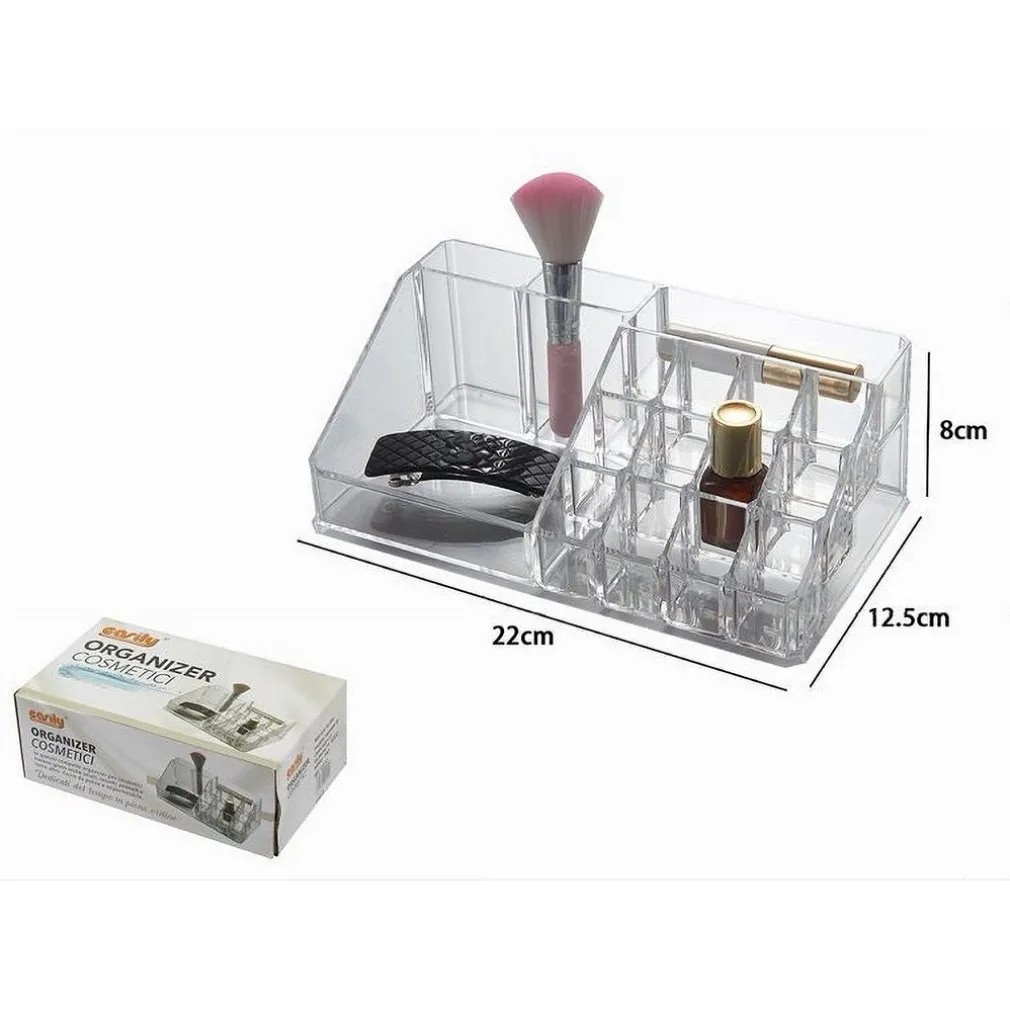 Scopri il pratico ed utile organizer porta trucchi, ideale per tenere in ordine tutto il tuo make up. Questo organizer box trasparente con 16 scomparti è perfetto per inserire rossetti, smalti, pennelli, mascara, creme e fondotinta. Grazie al suo design elegante, può essere utilizzato anche come complemento d’arredo per il bagno o la camera da letto, rendendolo un espositore ideale per i tuoi cosmetici. Realizzato in plastica resistente e trasparente, ti aiuterà a trovare facilmente tutti i trucchi che cerchi!