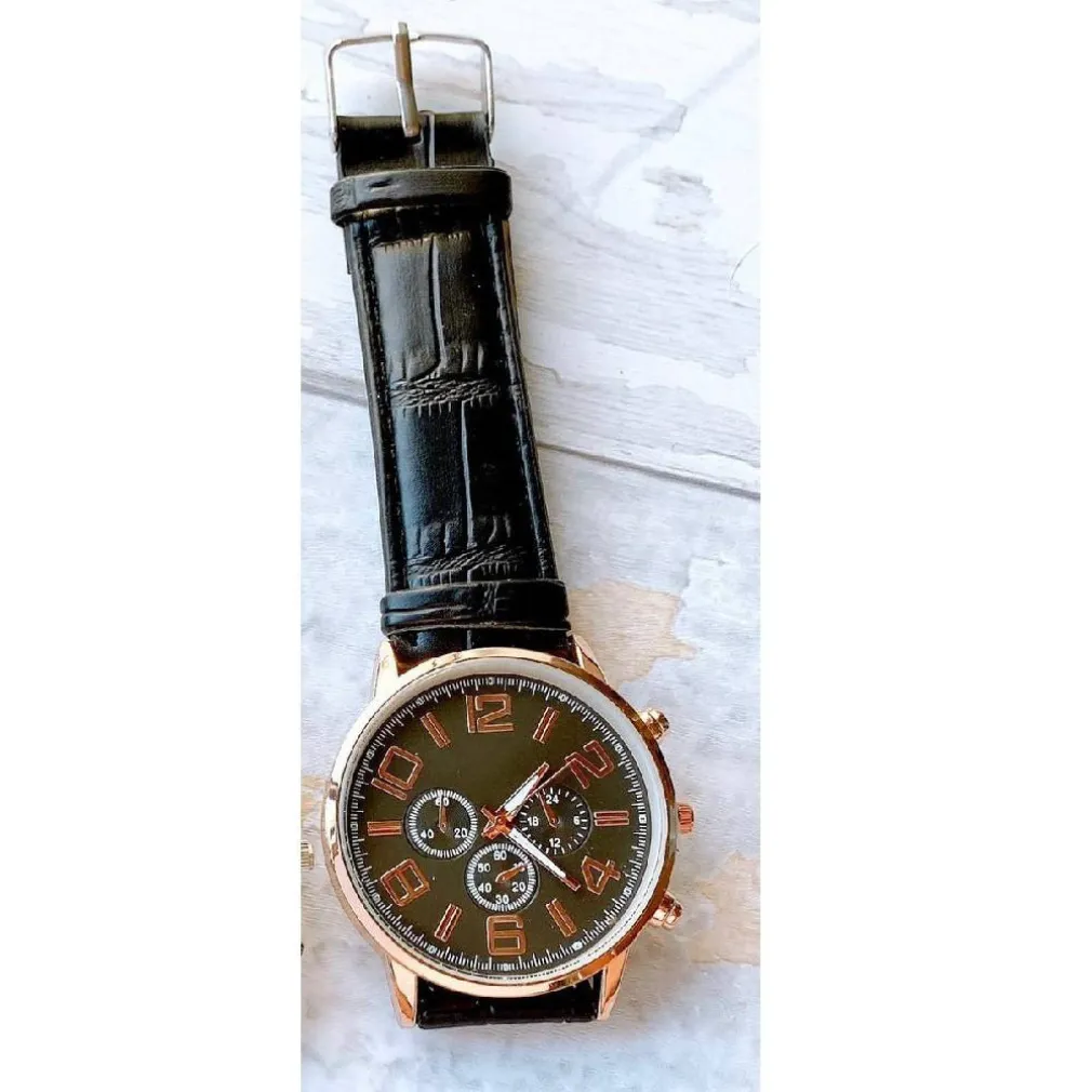 - 1 Orologio da polso uomo analogico cronografo con cinturino in pelle elegante dorato e nero.