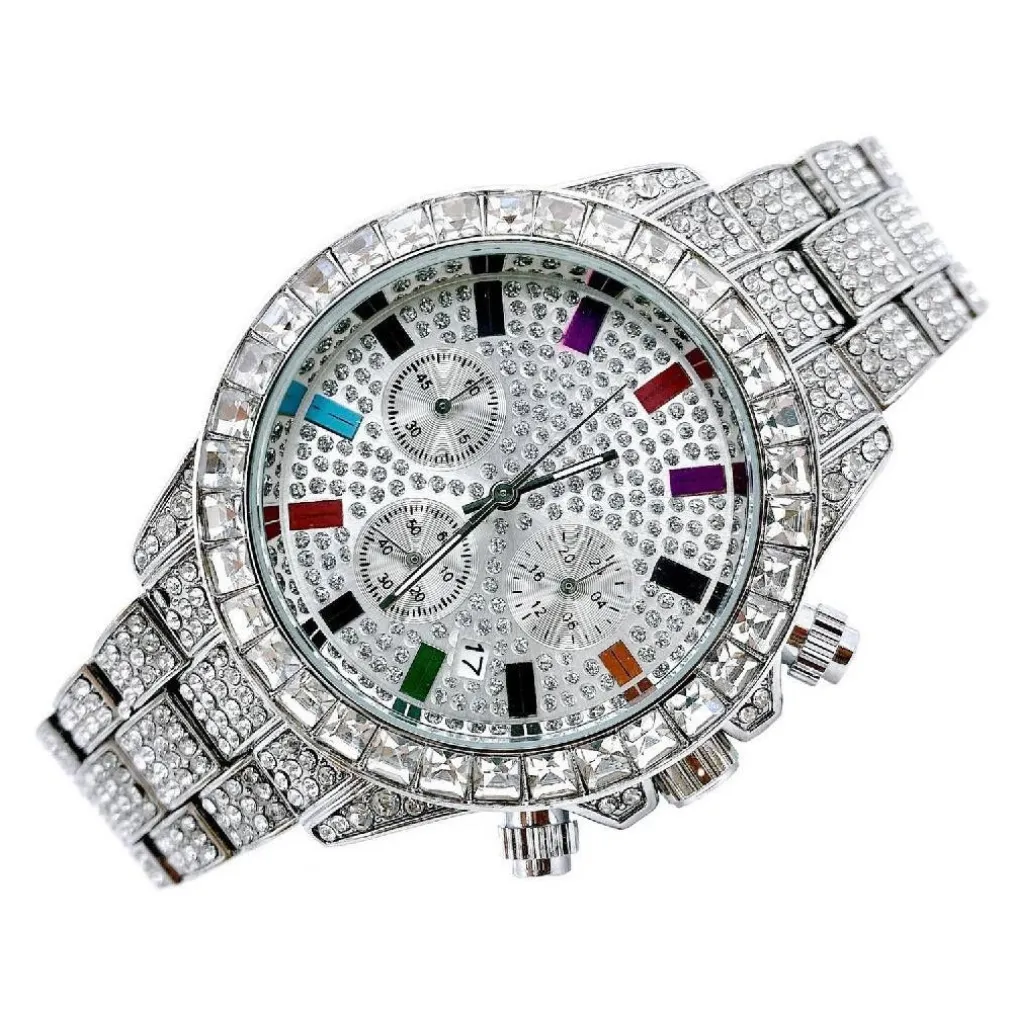 La custodia in lega conferisce all’orologio robustezza, mentre i dettagli in diamanti aggiungono un tocco di lusso e glamour. Il movimento al quarzo assicura una precisione impeccabile nel tenere il tempo, mentre il calendario integrato consente di organizzarsi con facilità.