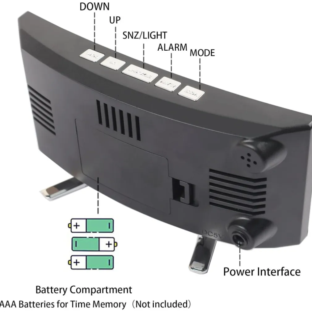 Nuovissimo pratico e comodo orologio da tavolo con lettura sul suo display lcd di TEMPERATURA, DATA, ORA. Dotato di funzione sveglia integrata e pulsantiera posta nella parte retrostante il display per un DESIGN MODERNO e TECNOLOGICO. Si accende con un colpetto e va alimentato a batteria 3 AAA MINISTILO (NON INCLUSE NELLA CONFEZIONE) Date un tocco di modernità alle vostre case, uffici, e quant’altro con questo elegante orologio.
