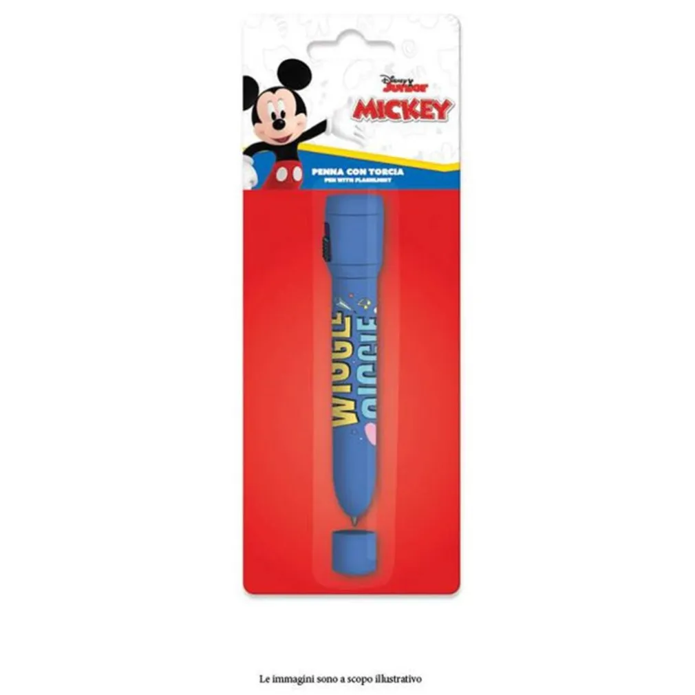 È una penna dotata di una piccola torcia integrata, decorata con il tema di Mickey Mouse, pensata per un uso scolastico e come gadget regalo.