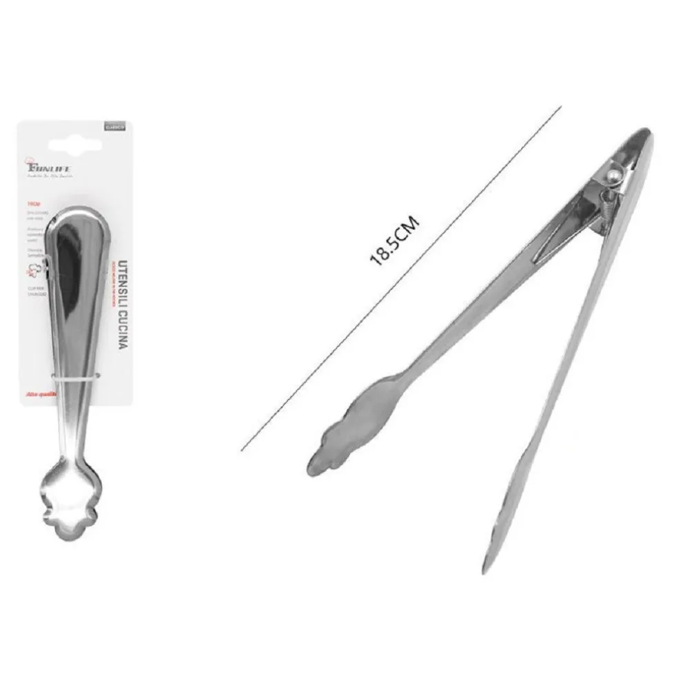 Quali sono le dimensioni di questa pinza? La pinza ha una lunghezza di 18.5cm, che la rende comoda da utilizzare in qualsiasi situazione in cucina.