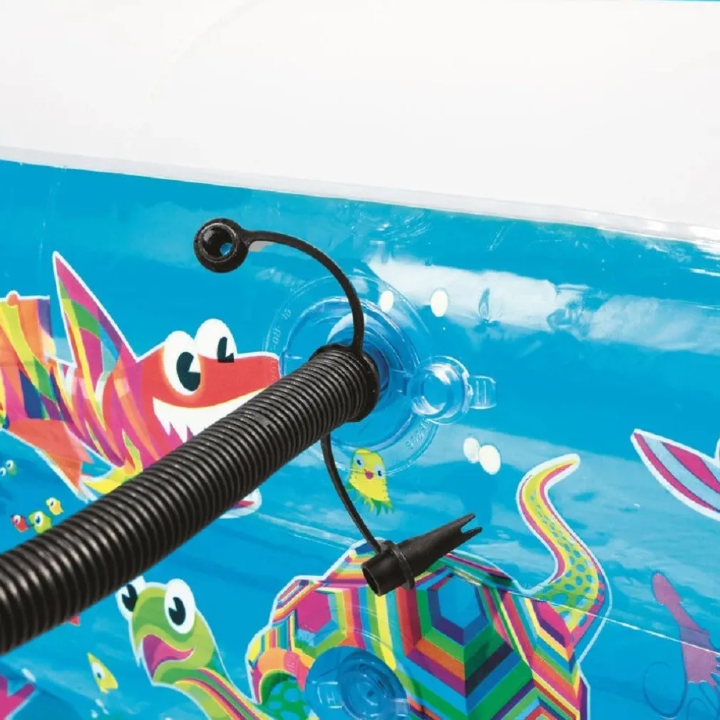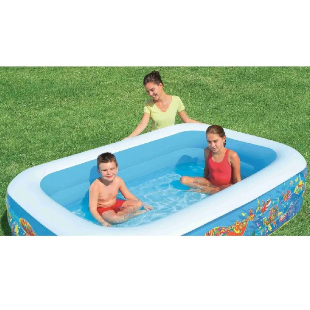 Piscina rettangolare gonfiabile per bambini, con 3 anelli gonfiabili. Realizzata in Vinile di colore blu con fantasia “acquario” e valvole di sicurezza. Ideale per far giocare il tuo bambino in giardino o in campagna.