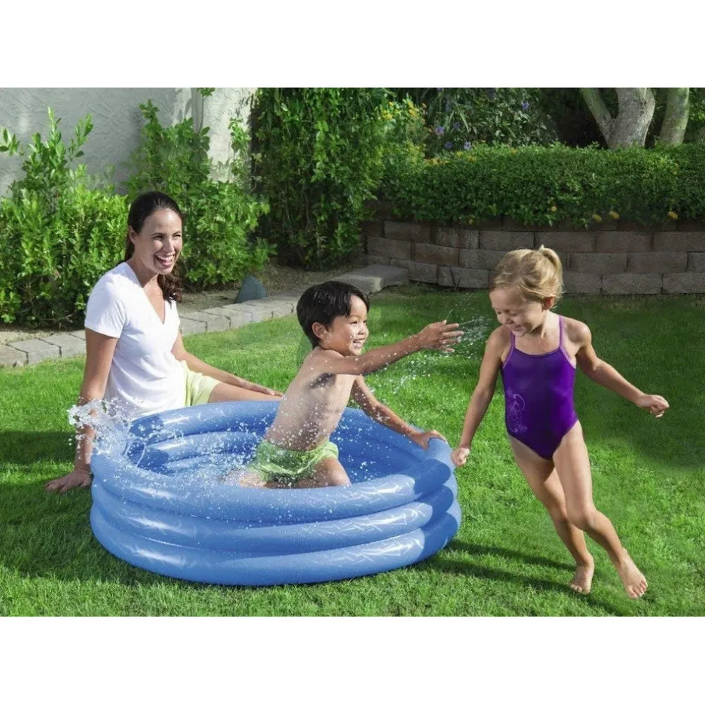 È una piscina per bambini dal design semplice ma elegante, realizzata in PVC, con tre anelli gonfiabili che ne garantiscono la stabilità. Ha una capienza di 101 litri e un diametro di 102 cm, rendendola ideale per giochi all’aperto.