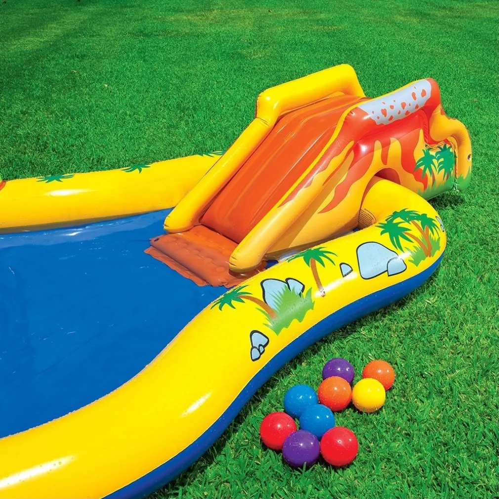 Questo bellissimo playground gonfiabile è dotato di mini scivolo gonfiabile, arco con doccia e palma con fontana entrambi funzionanti tramite l’apposito attacco con la canna da giardino, grandissimo canestro a forma di dinosauro da utilizzare con le 6 palline colorate. Il tutto è realizzato in PVC di altissima qualità e decorato con scenari dei dinosauri che renderanno l’esperienza di gioco davvero emozionante. Il tappo di scarico acqua garantisce lo svuotamento della piscina in maniera facile e veloce.