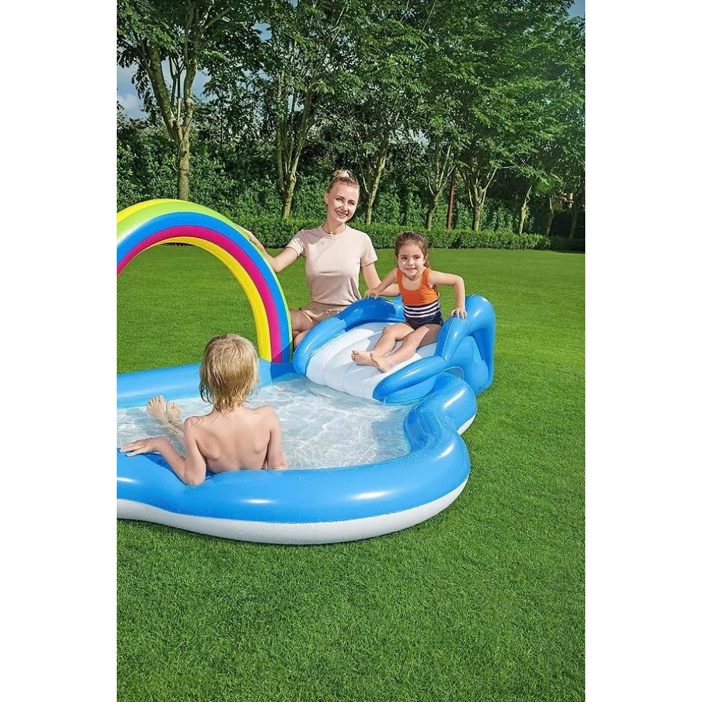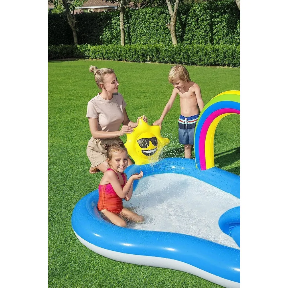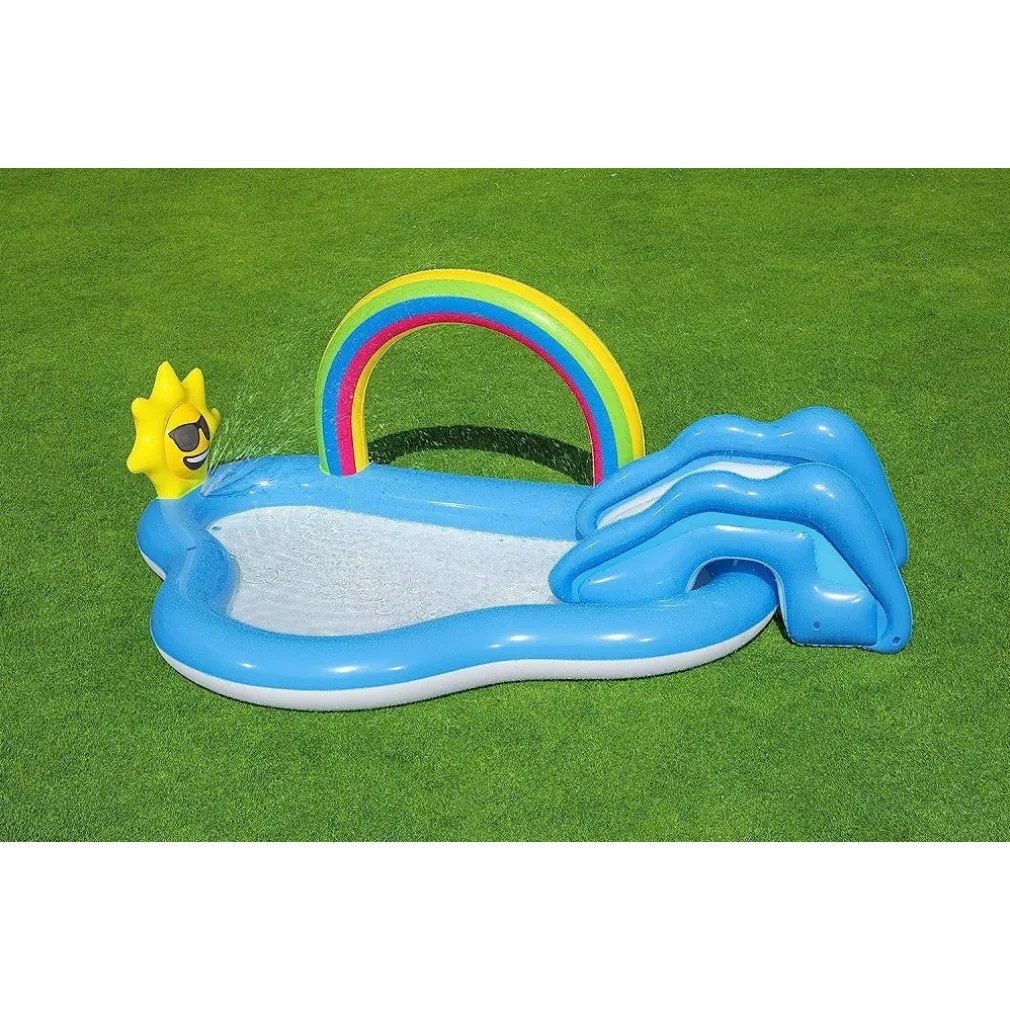 Sotto questo sole, bello rinfrescarsi! La piscina gioco è perfetta per ore e ore di divertimento nelle belle giornate! Grazie allo scivolo rimovibile e all’area di atterraggio imbottita, i vostri bimbi vi imploreranno di poter andare fuori a giocare. Come plus aggiunto, le grandi dimensioni della piscina assicurano una giornata piena di divertimento acquatico! Collegala a un tubo da giardino e vedrai che lo spruzzatore a forma di sole comincerà a spruzzare acqua, aggiungendo quel tocco in più di divertimento. E una volta che i bimbi saranno soddisfatti, basterà svuotare la piscina attraverso la valvola di scarico e piegarla per essere riposta con facilità.