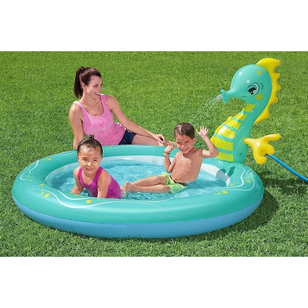 La piscina con spruzzatore a forma di cavalluccio marino è ottima per tutti quei bambini in cerca di divertimento. Presenta una grafica accattivante con un grande cavalluccio marino gonfiabile come attrazione principale. Basta collegare un tubo da giardino e l’acqua comincerà a sgorgare, creando un divertente effetto fontanella che farà divertire i vostri bimbi.