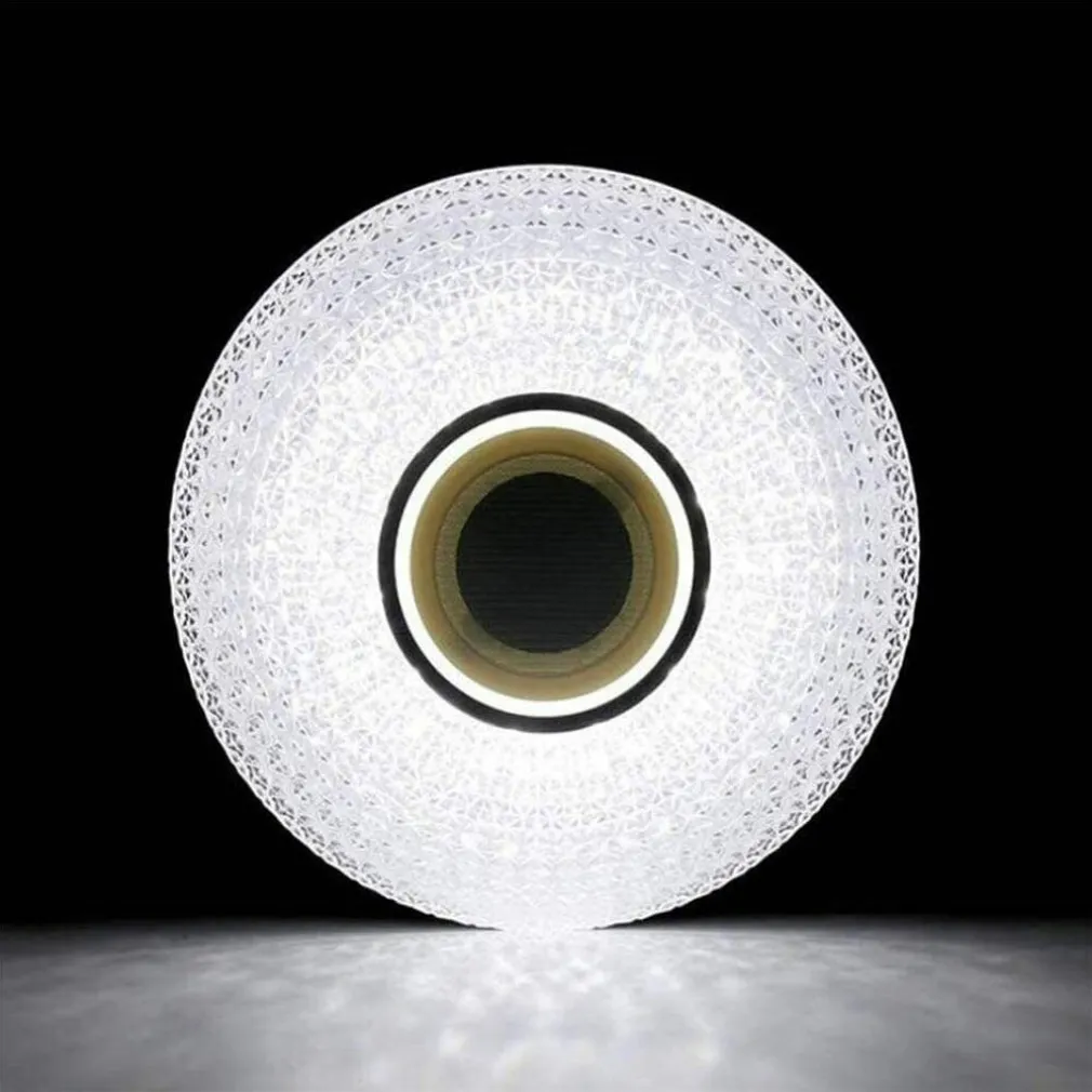 Plafoniera LED 62W RGB multicolore 2 in 1 dotata di cassa speaker con tecnologia Bluetooth. Design effetto cristallo, ma interamente realizzato in plastica abs, ideale per creare fantastici effetti di luce colorata in ambienti moderni come camere da letto, cucine moderne, soggiorni, camerette, locali commerciali, negozi, ed in tutti quei posti dove oltre ad avere una fonte di luce si vuole anche ascoltare la musica attraverso il proprio smartphone. Realizzata in alluminio con diffusore in acrilico questa plafoniera è dotata di LED integrati con una potenza di 62W. Infatti questa plafoniera è dotata di cassa speaker Bluetooth che consente la riproduzione di musica direttamente dal proprio cellulare, inoltre è possibile gestire la luce sia dal proprio cellulare tramite apposita APP oppure tramite il telecomando in dotazione. Possiamo cambiare colore, aumentare o diminuire l’intensità luminosa, alzare o abbassare il volume dello speaker e controllare la riproduzione. Inoltre tramite l’APP del cellulare è possibile impostare diversi effetti tra cui la modalità che cambia il colore a ritmo di musica, l’effetto che cambia rapidamente colore oppure quello che varia lentamente il colore adatto per la cromoterapia, e tanti altri ancora.