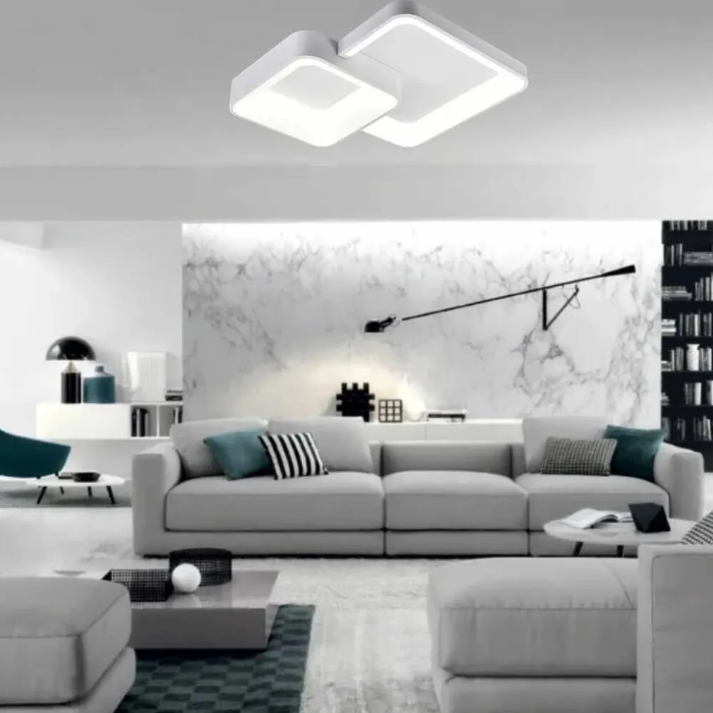 Il lampadario LED 2 quadrati è realizzato in PS + metallo, con una forma geometrica raffinata e minimalista che si adatta facilmente a qualsiasi arredamento.