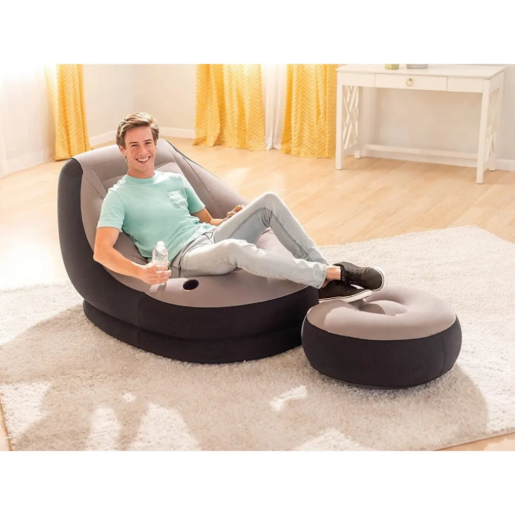Scopri la bellezza della poltrona Lounge gonfiabile. Il design neutro ed essenziale dona a ciascun ambiente della casa un look moderno e comfy. Inoltre, puoi allungare le gambe e poggiare i piedi sull’ottomana, per un relax maggiore. Il morbido rivestimento floccato e il porta bicchieri incorporato rendono ancora più piacevoli i tuoi momenti di riposo.