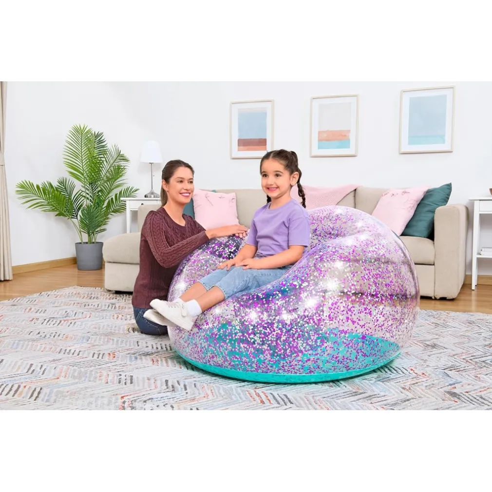 La Glitter Dream non è solo una seduta comoda, ma un elemento decorativo ricco di fascino. Grazie al suo design trasparente con glitter viola e argento, diventa immediatamente un oggetto desiderato da ogni bambino. La sua praticità nell’uso, facilità di gonfiaggio e leggerezza ne fanno una scelta eccellente per ogni famiglia.