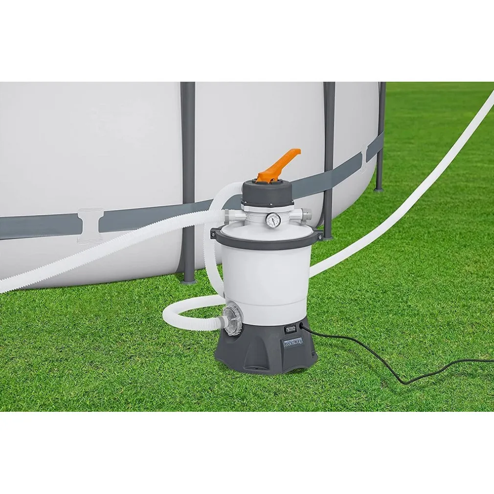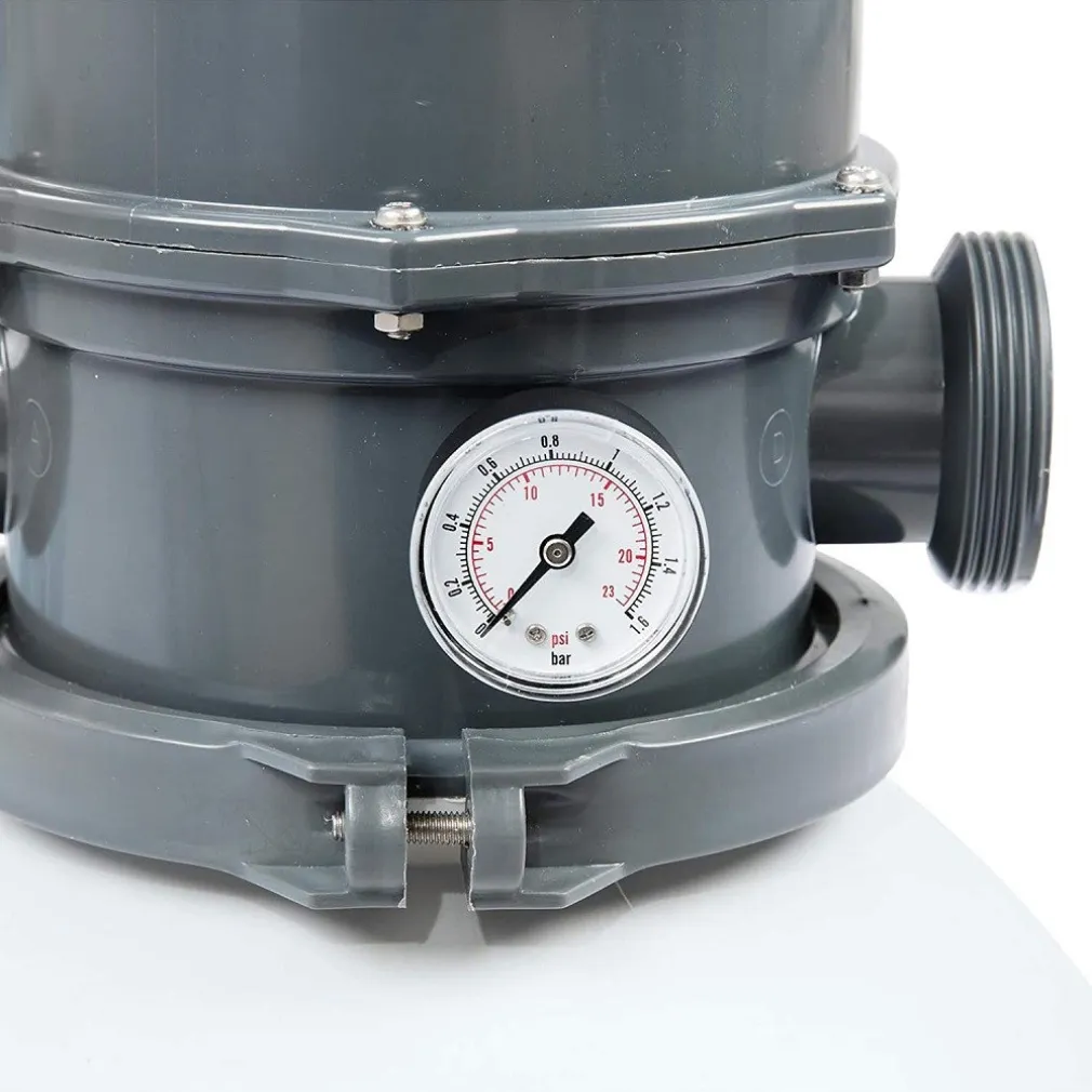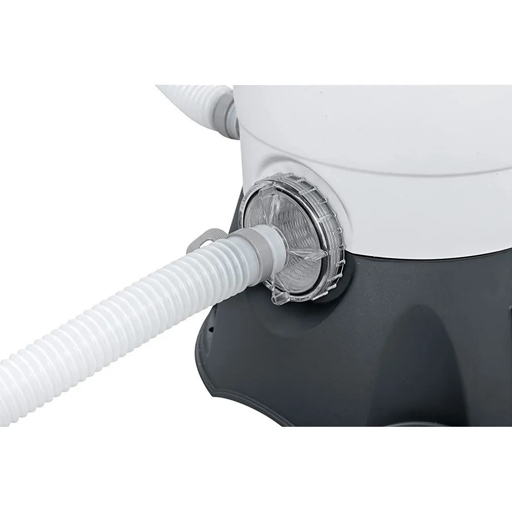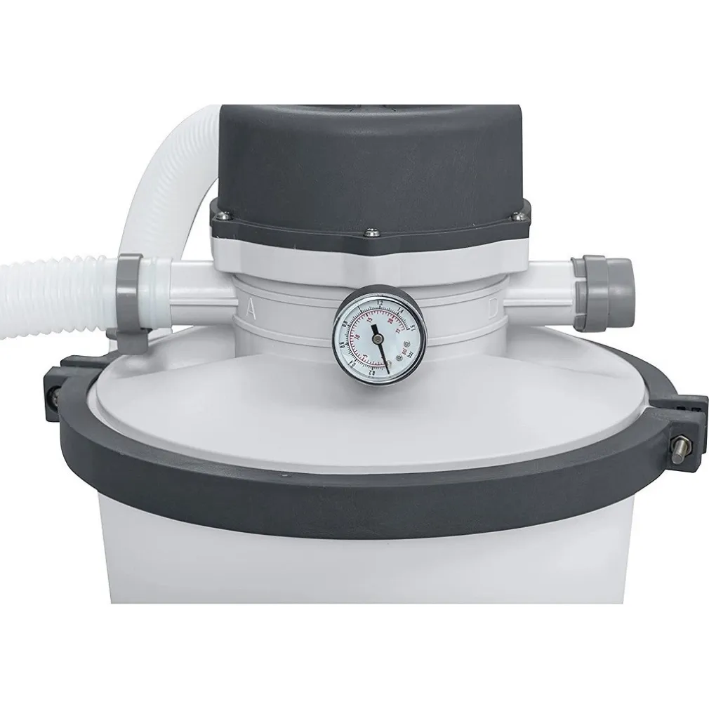 La pompa di filtraggio a sabbia 3.028 L è la soluzione ideale per piscine da 1.100 – 18.100 L d’acqua. Il serbatoio di filtraggio è resistente e anticorrosione, dotato di una maniglia a flangia che può essere ruotata di 360° per una semplice installazione. È dotata anche di un manometro integrato di facile leggibilità e un dosatore Chemconnect per mantenere e fornire un’acqua pulita e salutare. Si consiglia di utilizzare tubi di diametro di 3,2 cm. Il pre-filtro a cestello offre una barriera supplementare che blocca detriti come foglie e sporcizia, inoltre allunga la vita della pompa. Il prodotto funziona con normale sabbia o con il Polysphere, altamente efficiente per il filtraggio.