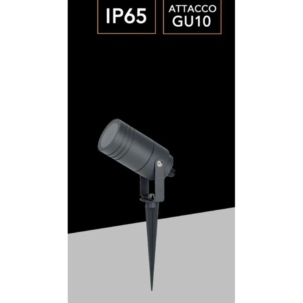 Il kit include il portafaretto in alluminio, il picchetto da interramento, una chiave a brugola per il montaggio e la base circolare di supporto. La lampadina GU10 non è compresa nella confezione.