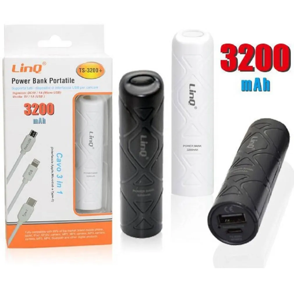- 1x Power Bank Batteria Esterna Portatile Ricaricabile 3200mAh con Cavo 3in1 TS-3200+