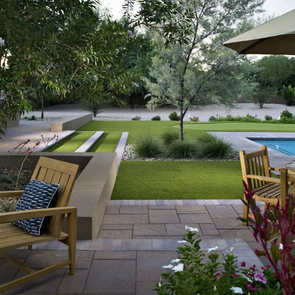 - Ideale per il bordo piscina, altra zona dove l’erba naturale soffre la presenza di molta acqua, spesso salata, dove regala una morbida superfice non sdrucciolevole su cui sedersi o prendere il sole