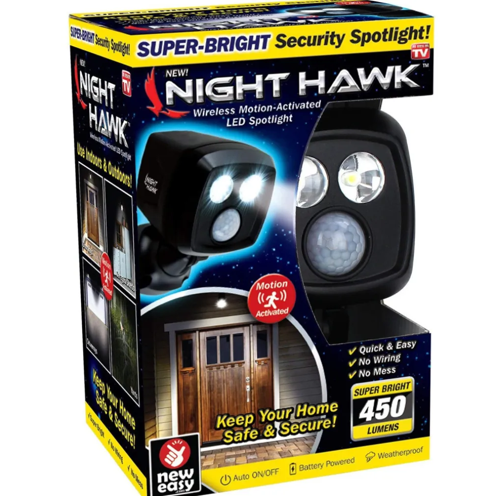 Ti presentiamo Night Hawk, il faretto luminoso per esterni di sicurezza a LED super luminoso! Questa potente luce LED da 450 lumen illumina fino a 675 piedi quadrati di aree scure intorno alla tua casa! Il sensore di movimento avanzato Night Hawk si attiva fino a 36 piedi di distanza e si spegne automaticamente dopo 20 secondi! Il sensore di luce diurna mantiene la luce spenta durante il giorno. La facile installazione wireless di Night Hawk ti consente di avere un’illuminazione istantanea ovunque ti serva! Installa in pochi minuti! Niente più cavi! Niente più casino! Imposta Night Hawk ovunque tu abbia bisogno di una luce super luminosa! Night Hawk è ottimo sia per uso interno che esterno! Realizzato in materiale resistente alle intemperie. Perfetto per le aree esterne non illuminate della tua casa come cortili, capanni, porte, garage, passi carrai, patii, ponti e altro! La testa regolabile del faretto ruota su e giù e ruota di 360 gradi! Darti illuminazione personalizzata per tutte le aree della tua casa! Night Hawk ti offre oltre 3.000 usi su un solo set di batterie! Batterie non incluse. Mantieni la tua casa al sicuro e protetta con la luce di sicurezza esterna di Night Hawk.