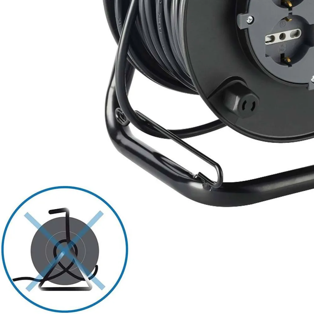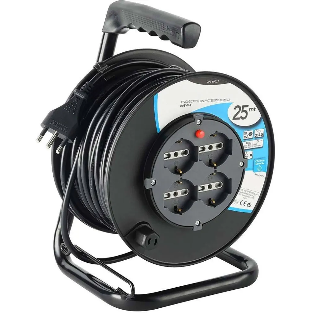 Avvolgicavi bricolage, 25 m, con disgiuntore di sicurezza; cavo H05VV-F 3×1,5 mm; 4 prese 10A/16A/Schuko, 230 V; spina 16A; potenza massima cavo SVO 3200 W. Prolunga elettrica con avvolgicavo 4 prese polivalenti (schuko 10/16A) spina grande 16A. Cavo HO5 VV-F sezione 3G1,5 mm² lunghezza 25 metri. Protettore di sicurezza – scollega la corrente quando la potenza supera il limite di portata. Tutte le prese sono dotate di children safety – impedisce di introdurre corpi estranei nella presa in tensione. Potenza massima quando il cavo è avvolto: 1100W. Potenza massima quando il cavo è svolto: 1200W. Cavo H05VV-F 3×1,5 mm. Potenza massima cavo SVO 3200 W. Con disgiuntore di sicurezza.