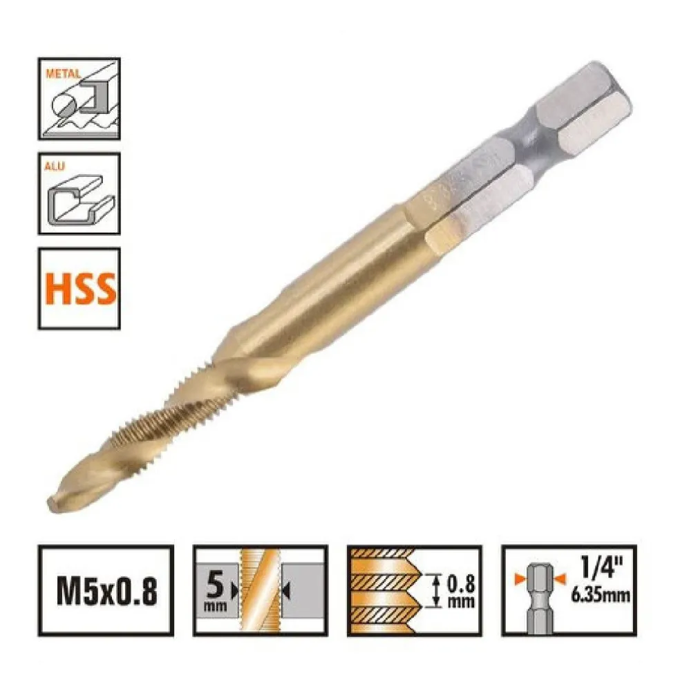 - 1x Punta per Trapano M5x0.8mm in Titanio HSS con Filettatura Metrica Metallo 57211
