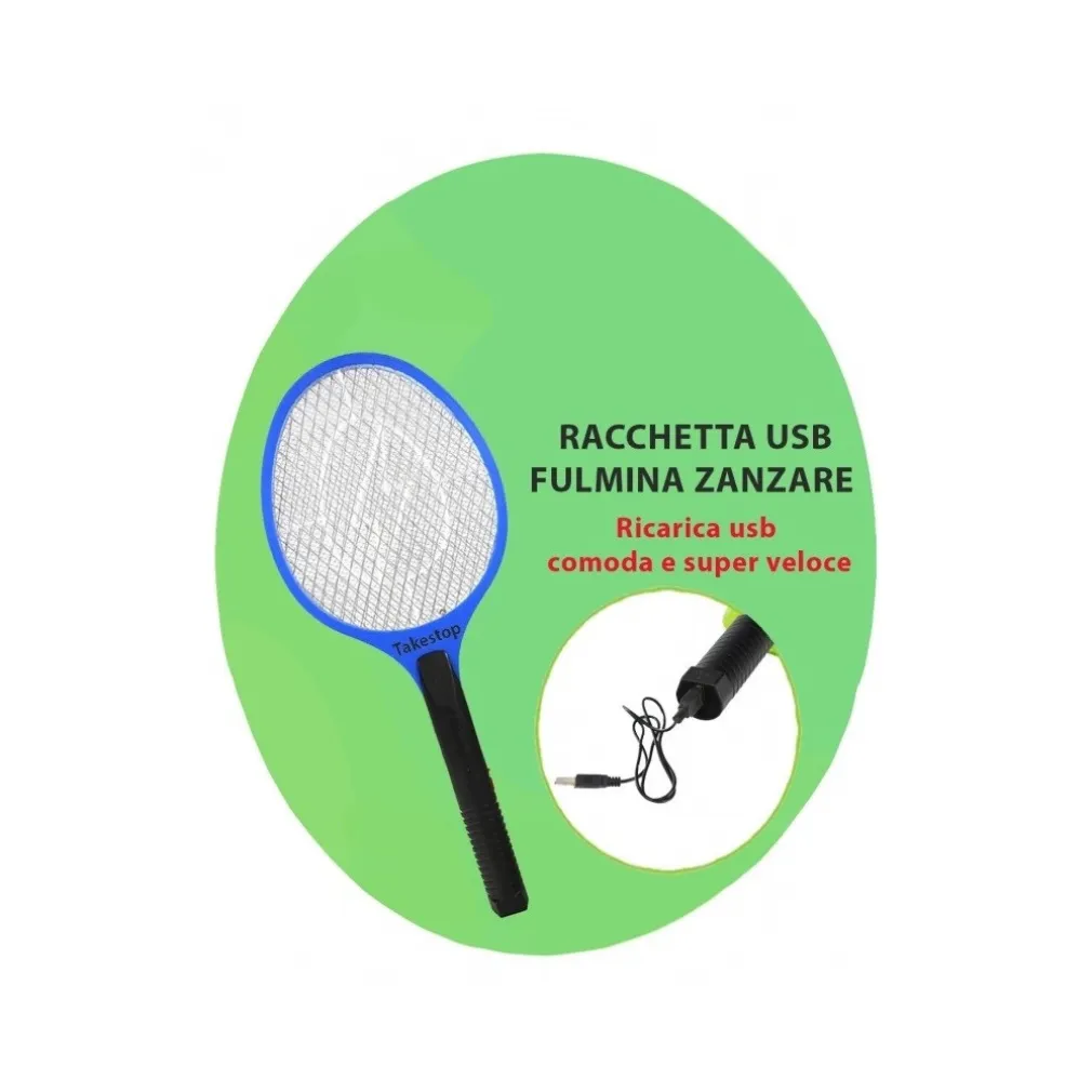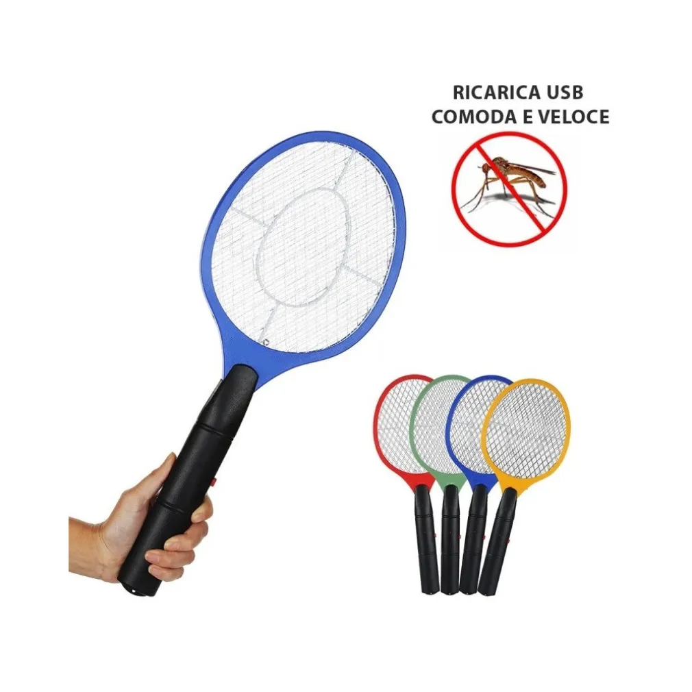 RACCHETTA USB RICARICABILE RICARICA VELOCE CAVO MICROUSB COMODA 3 RETI METALLICHE FULMINA ZANZARE INSETTI MOSCHE. COLORE CASUALE.