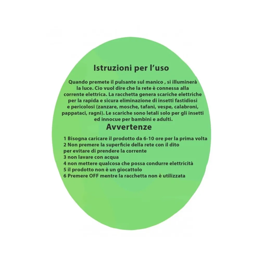Quando premete il pulsante sul manico, si illuminerà la luce. Cio vuol dire che la rete è connessa alla corrente elettrica. La racchetta genera scariche elettriche per la rapida e sicura eliminazione di insetti fastidiosi e pericolosi (zanzare, mosche, tafani, vespe, calabroni, pappataci, ragni). Le scariche sono letali solo per gli insetti ed innocue per bambini e adulti.