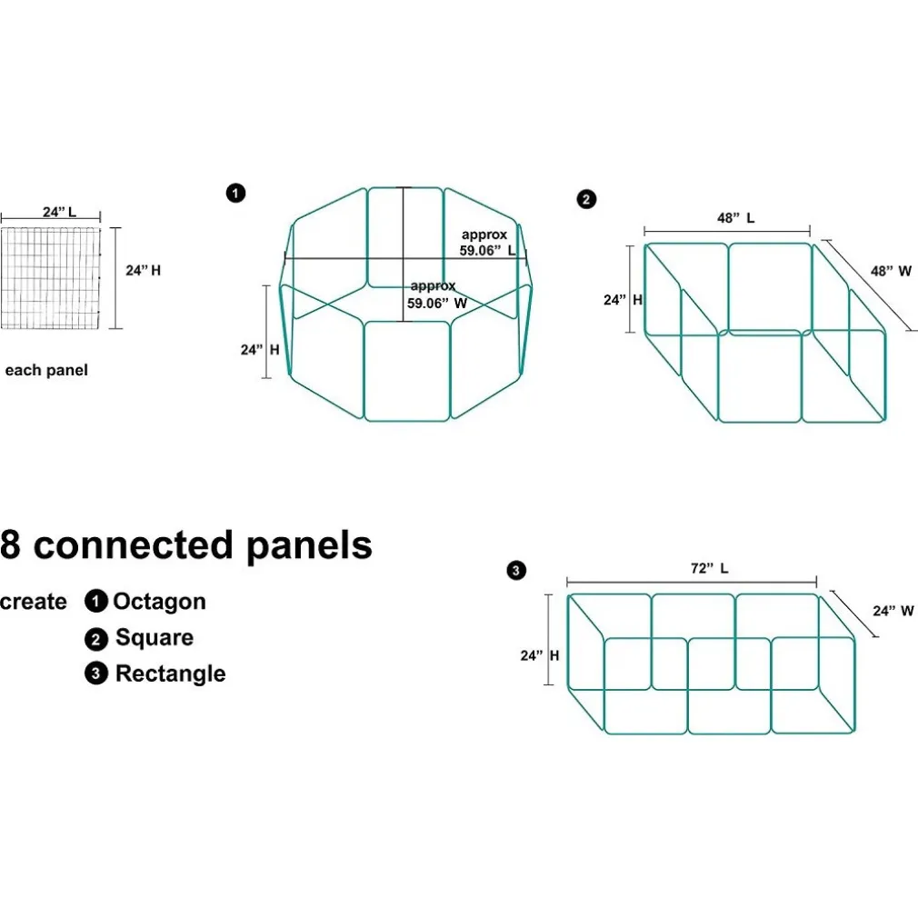 - La recinzione si monta rapidamente e in tutta semplicità, senza bisogno di attrezzi. Gli 8 pannelli in metallo sono connessi tramite cerniere in metallo, diventando un unico pezzo che si apre e chiude come una fisarmonica. Potrai dare alla recinzione la forma di un cerchio, un quadrato, un rettangolo o una qualsiasi altra forma. Chiudi i pannelli tramite i ganci in metallo (inclusi). I pannelli possono anche essere usati per delimitare aree di una stanza a cui non vuoi che i tuoi cuccioli accedano. Puoi anche connettere la recinzione a una gabbia in metallo (non inclusa), per creare la perfetta combinazione fra spazio gioco e area relax. Se posizionata all’esterno, potrai assicurare la recinzione al terreno grazie ai picchetti a U in metallo in dotazione. Connetti facilmente 2 set per raddoppiare lo spazio (venduti singolarmente).