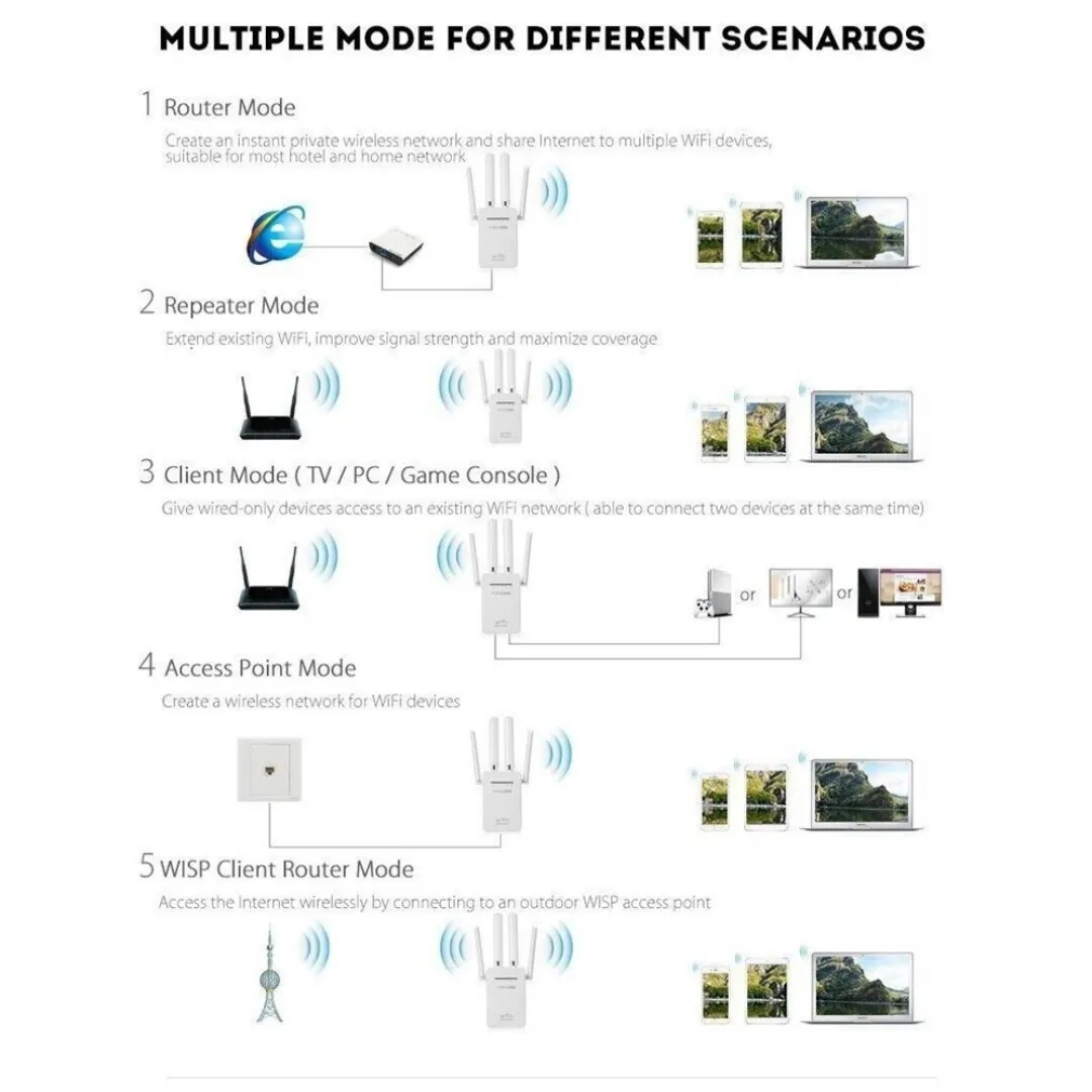- Il ripetitore è compatibile con dispositivi che supportano gli standard wireless IEEE 802.11 b/g/n, coprendo la maggior parte degli smartphone, tablet e computer moderni.