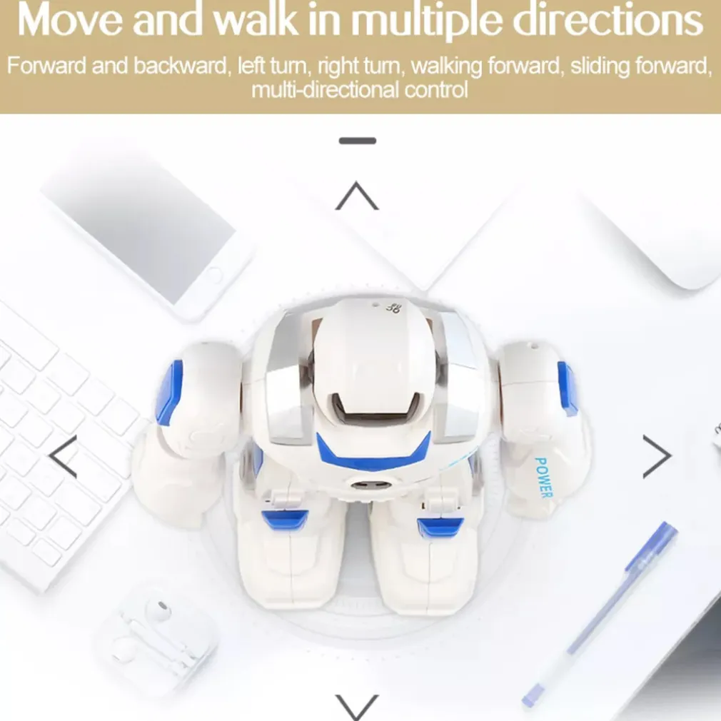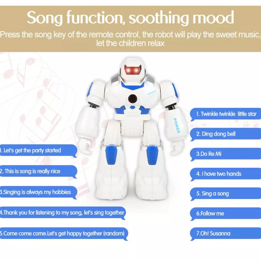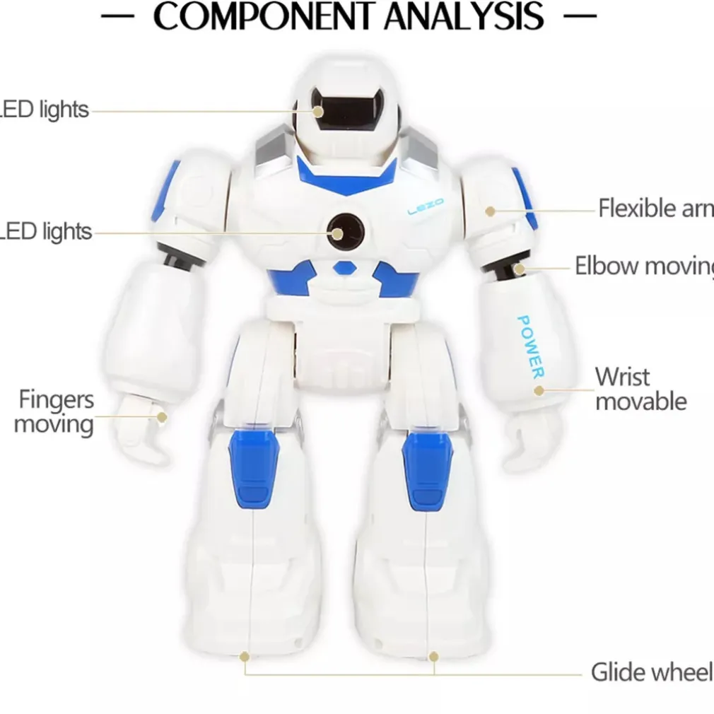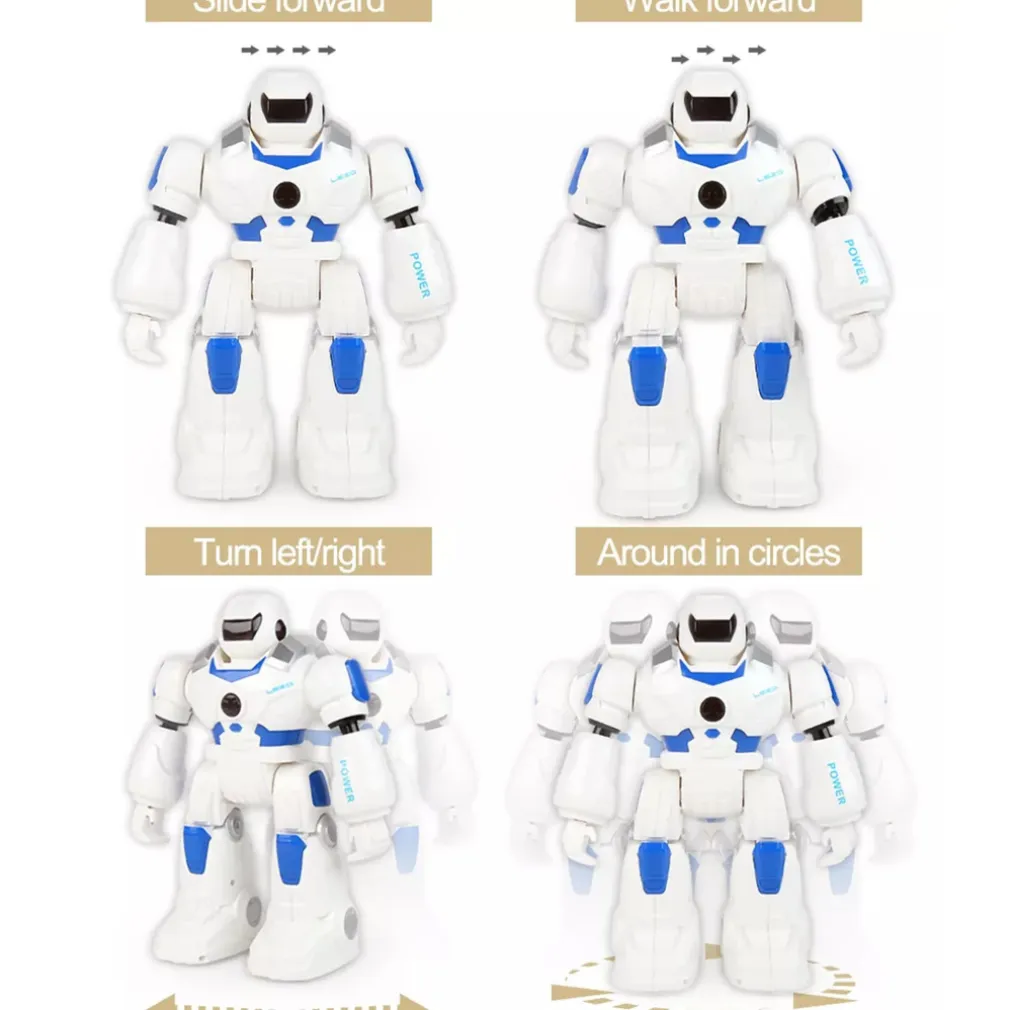 Smart Bot è ricco di funzioni, puoi controllarlo in 2 modi attraverso l’apposito teleomando ad infrarossi oppure tramite il controllo a gesti, muovi la mano in avanti per fare avanzare il robot, posizionala di fronte per farlo andare indietro, muovila a destra/sinistra per farlo ruotare. Può eseguire fino a 50 azioni programmabili, buo ballare e parlare con la sua voce robotica, i suoi occhi con led possono esprimere diverse espressioni facciali, ha 2 modalità di movimento, può camminare e scivolare e la velocità di movimento e il volume sono regolabili.
