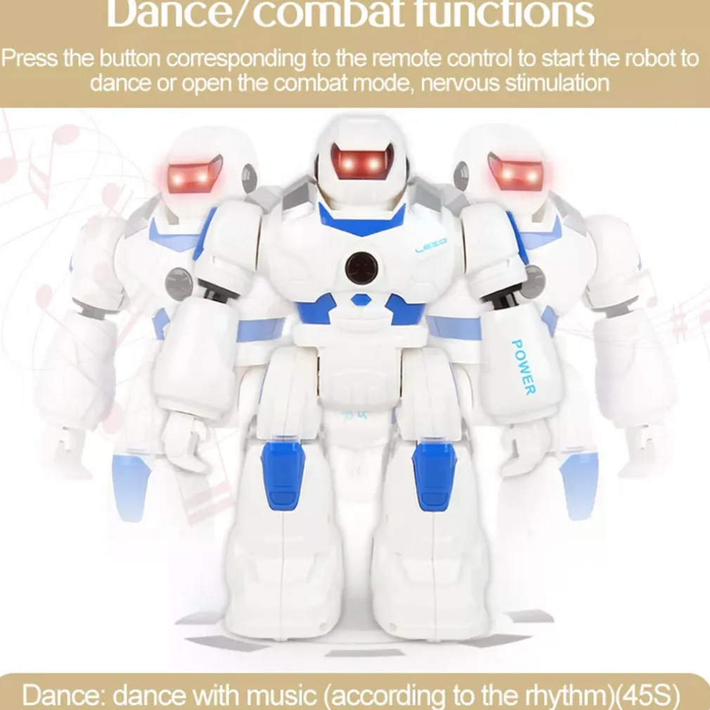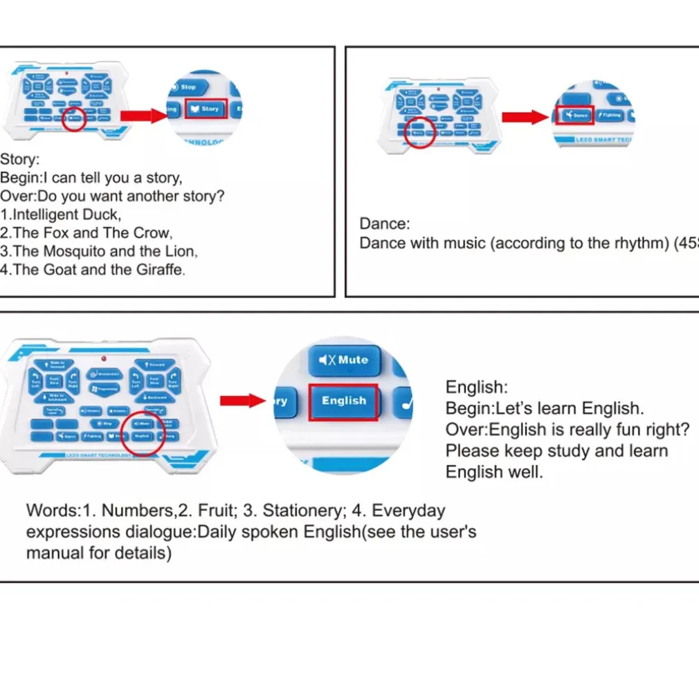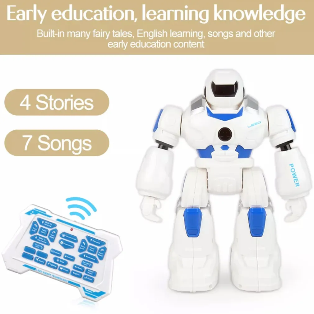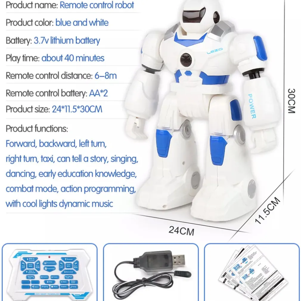 Smart Bot è ricco di funzioni, puoi controllarlo in 2 modi attraverso l’apposito teleomando ad infrarossi oppure tramite il controllo a gesti, muovi la mano in avanti per fare avanzare il robot, posizionala di fronte per farlo andare indietro, muovila a destra/sinistra per farlo ruotare. Può eseguire fino a 50 azioni programmabili, buo ballare e parlare con la sua voce robotica, i suoi occhi con led possono esprimere diverse espressioni facciali, ha 2 modalità di movimento, può camminare e scivolare e la velocità di movimento e il volume sono regolabili.
